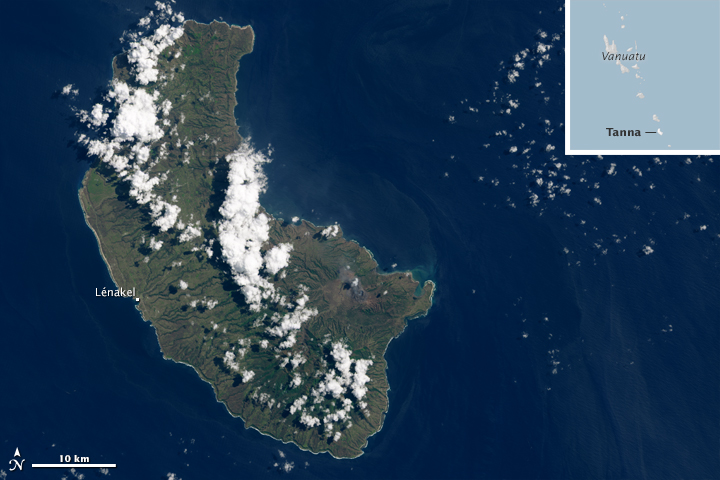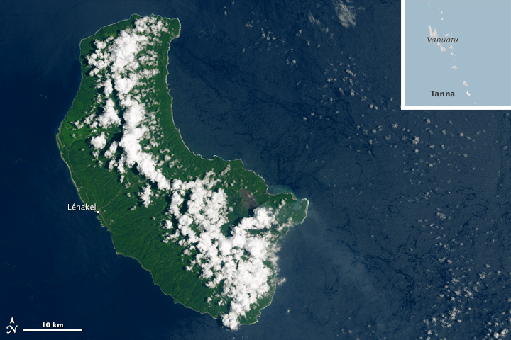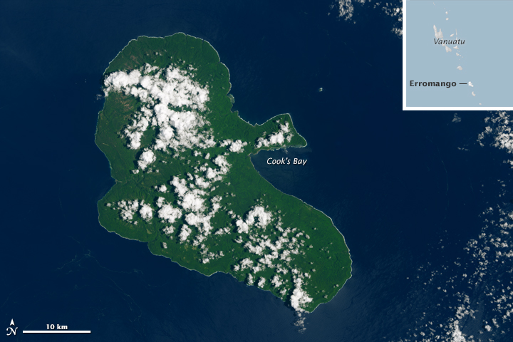 According to scientists from Tropical Storm Risk, Erromango likely faced the most severe winds. Their analysis of Pam’s wind field—based on data from the Joint Typhoon Warning Center and an analytical model of the atmosphere—suggested that Erromango saw gusts up to 320 kilometers (200 miles) per hour. With top gusts of 260 kilometers (160 miles) per hour, Tanna faired slightly better in the analysis. With Erromango’s vegetation appearing slightly browner and more disturbed than Tanna’s, this Landsat imagery supports that interpretation.