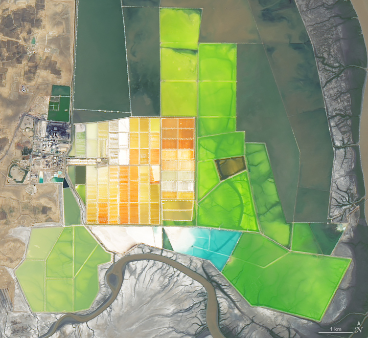 These images show the city of Bhavnagar, which is located in one of the major salt-producing districts in the state. They were acquired on February 28, 2019, by the Operational Land Imager (OLI) on Landsat 8. The colorful rectangles are salt evaporation ponds and often seen in major salt-producing areas, such as the Makgadikgadi Pan in Botswana.