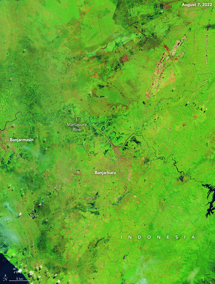 The image below (left) shows burn scars on the landscape near Banjarbaru, the capital city of South Kalimantan, on September 27, 2023. Most of the reds and dark browns are scars from fires that have burned so far during the 2023 fire season. Lighter browns are likely dry vegetation. For comparison, the other image (right) shows the same area on August 7, 2022. Both images are false color and were acquired by the OLI-2 (Operational Land Imager-2) on Landsat 9.