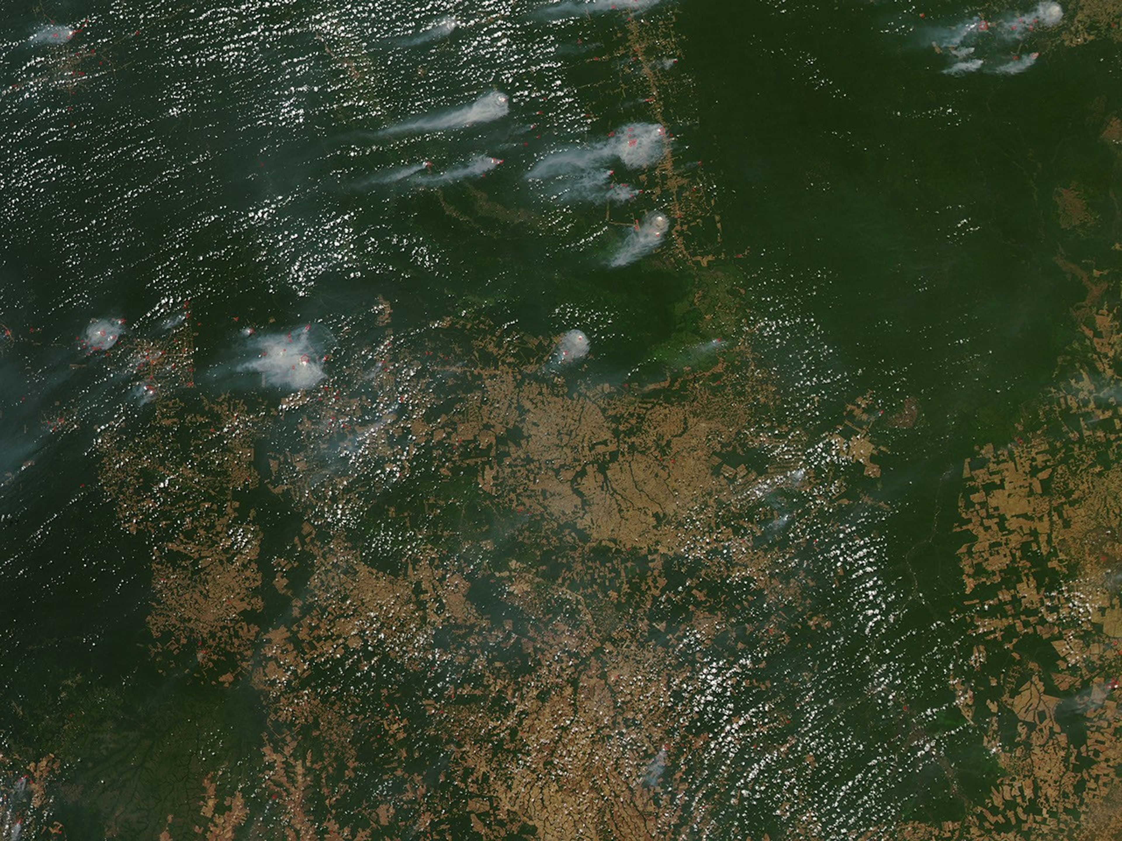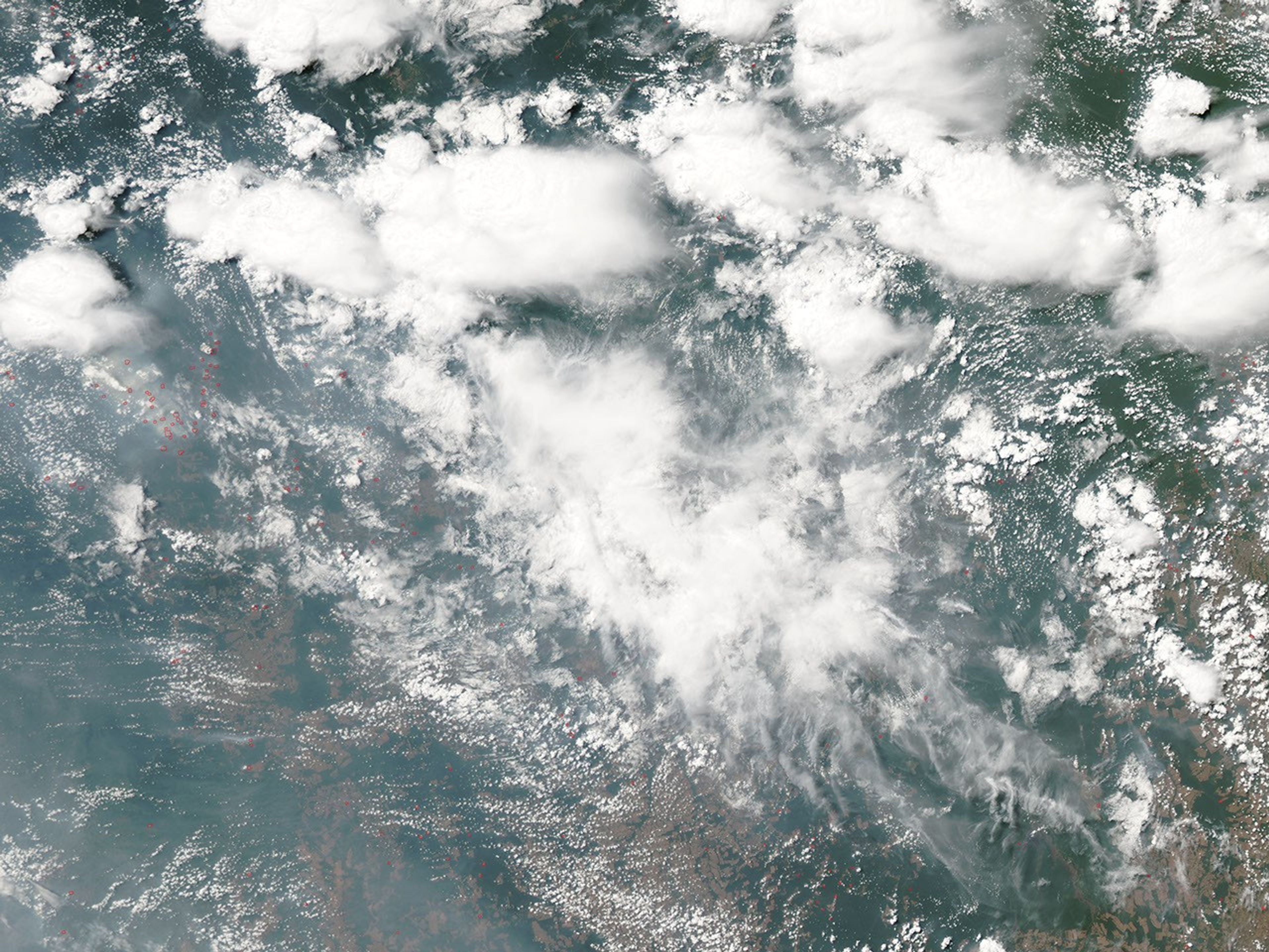 This trio of photo-like images illustrates steps in the initiation of the wet season in the southern Amazon in 2006. Captured by the Moderate Resolution Imaging Spectroradiometer (MODIS) on NASA’s Aqua satellite, they show a progression from mostly clear skies on August 7, to popcorn-like, scattered cumulus clouds on August 25, to more widespread thunderstorm activity on September 3.