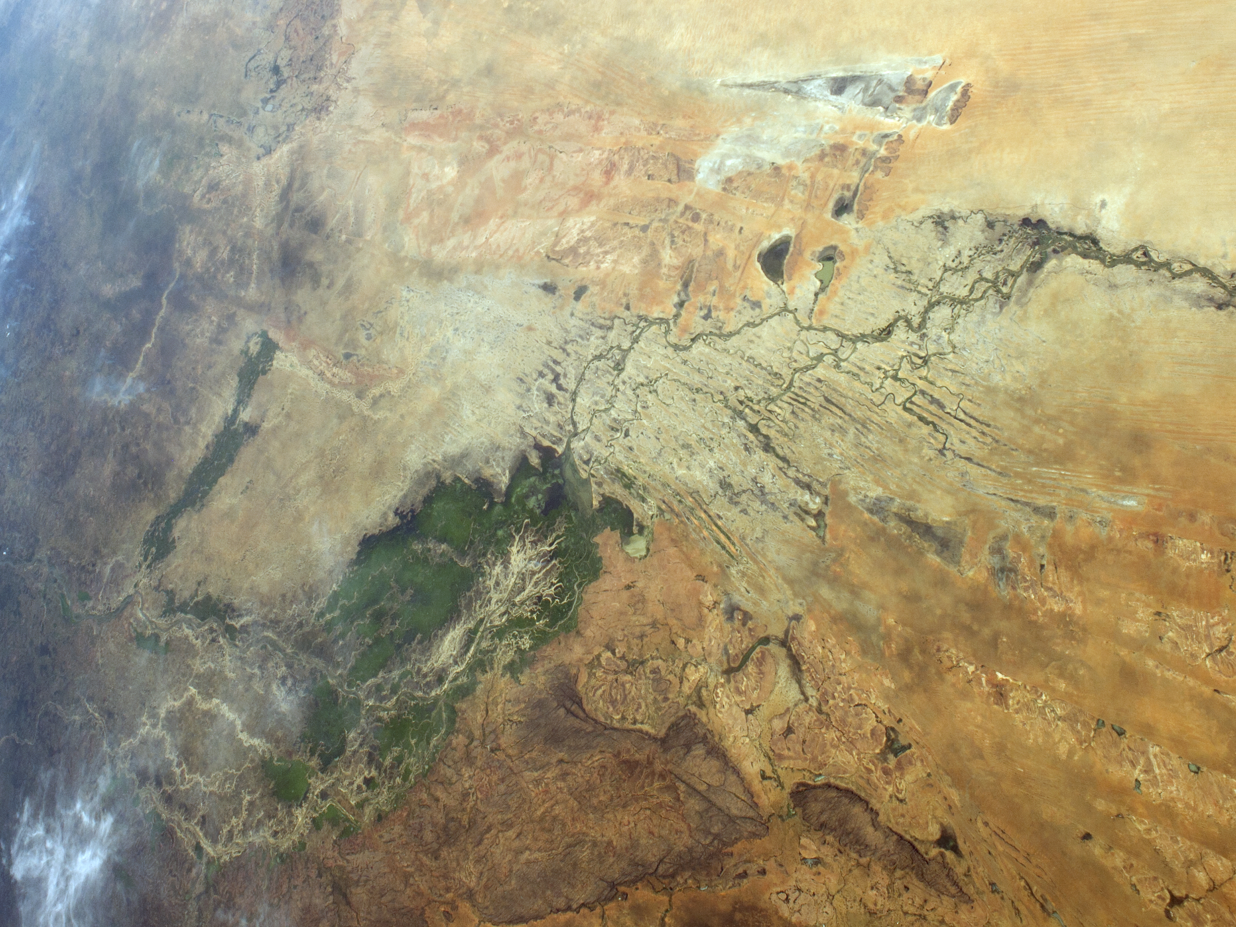 Apart from the delta of the Nile River, the inland delta of the Niger River may be Africa’s most famous. Astronauts aboard the International Space Station took this photograph of the region where the Niger and other rivers flow out of the wetter, more vegetated Sahel into the Sahara Desert. The rivers inundate the lush green wetland of the delta.