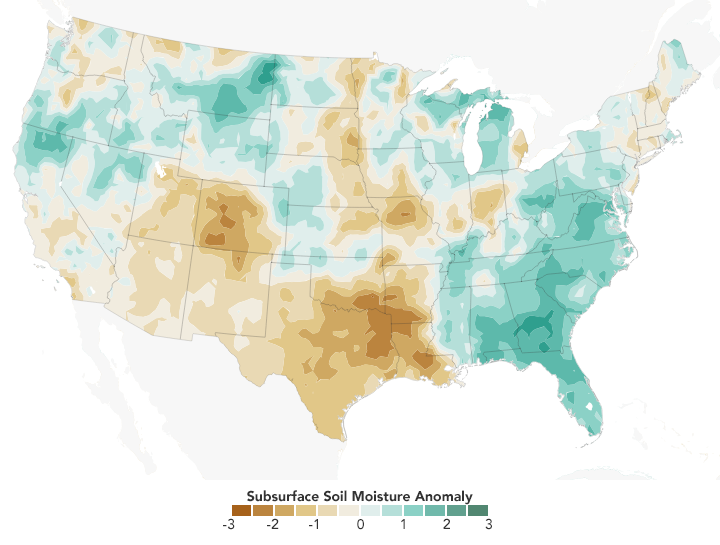 NASA Earth Observatory images by Joshua Stevens and Lauren Dauphin, using soil moisture data from NASA-USDA and the SMAP Science Team , and data from the United States Drought Monitor at the University of Nebraska-Lincoln. Story by Mike Carlowicz.