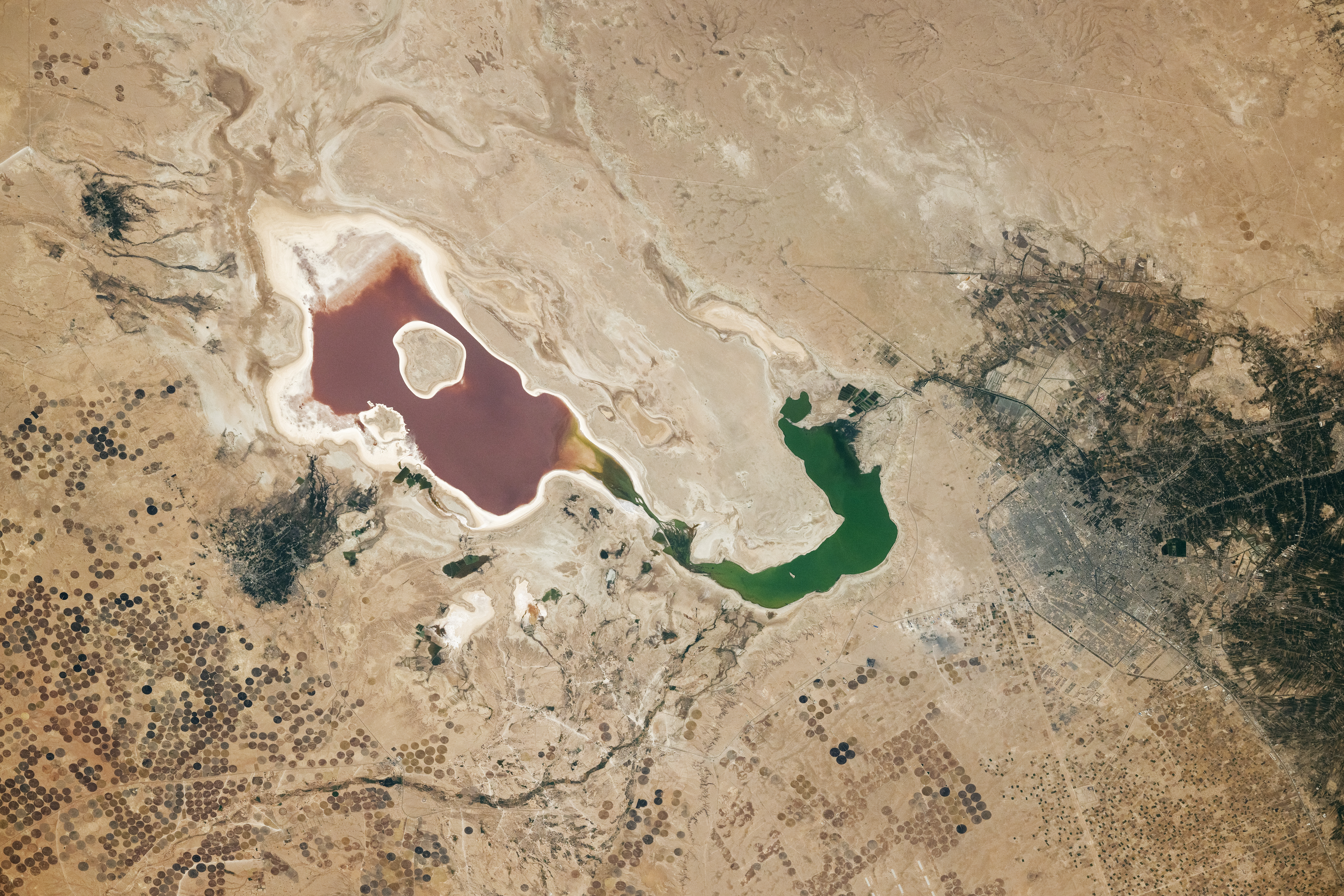 The red- and green-hued waterbodies in this photograph are remnants of Razazah Lake, an artificial lake in central Iraq. The lake, also known as Baḩr al-Milḩ (“Sea of Salt” in Arabic), is fed by overflow from Habbaniyah Lake, which lies just outside the top left corner of the image. An astronaut on the International Space Station (ISS) took the photo on September 23, 2024.
