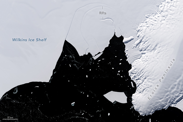 - NASA Earth Observatory (2013, May 25) Breakup Continues on the Wilkins Ice Shelf. Accessed April 5, 2024.