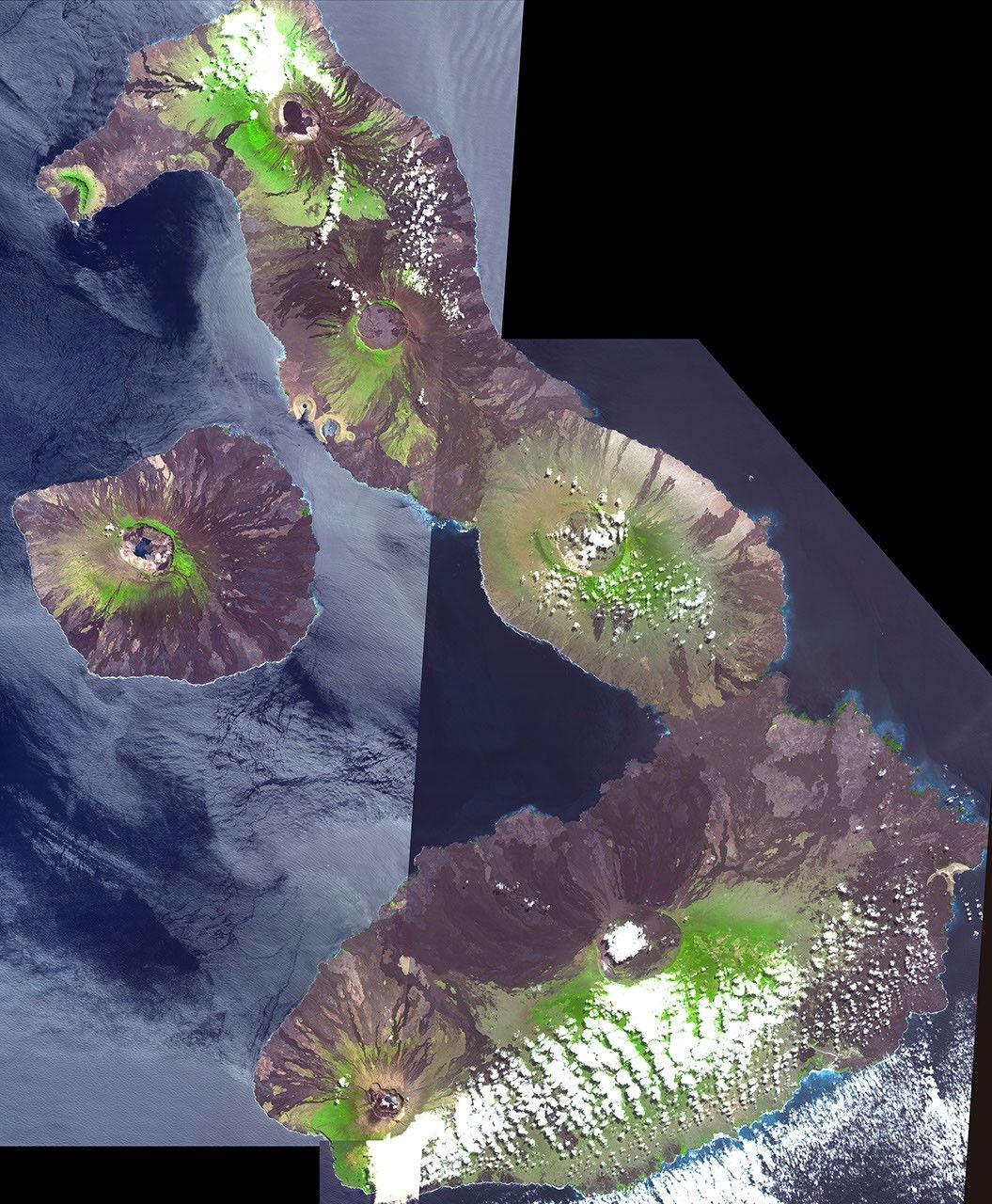 A fringe of brilliant green vegetation encircles the crater of the volcano in the center of Isla Fernandina, one of the Galapagos Islands, in this Advanced Spaceborne Thermal Emission and Reflection Radiometer (ASTER) image.