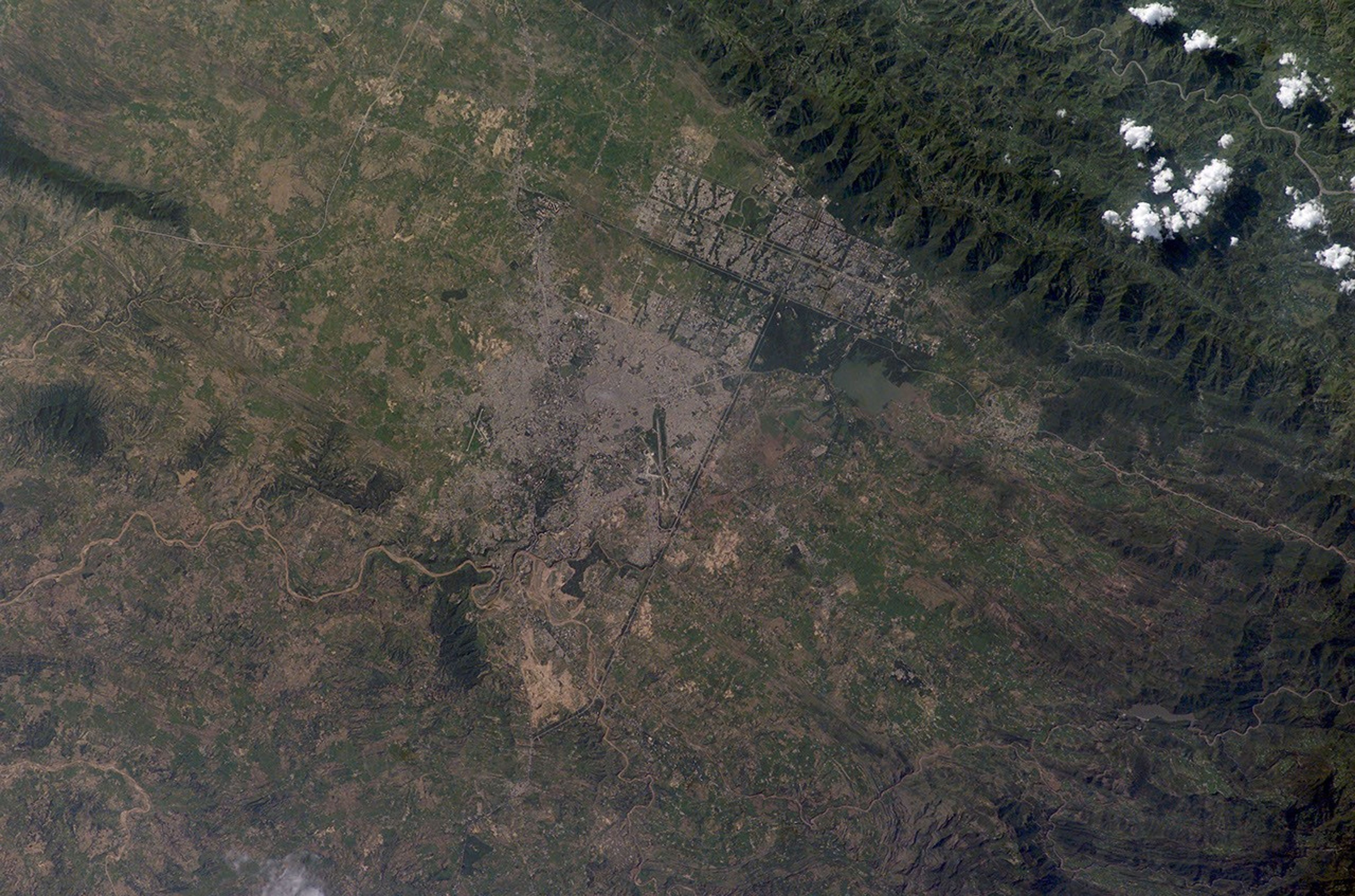 Two capital cities in Pakistan lie next to one another but display land use patterns that are entirely different. Islamabad, with a population of 901,000 (ca. 1998) boasts a master-planned rectangular street pattern nestled against the Margala Hills (top left). The larger Rawalpindi (population 1,406,214 in 1998) lies to the south on the Soan River.