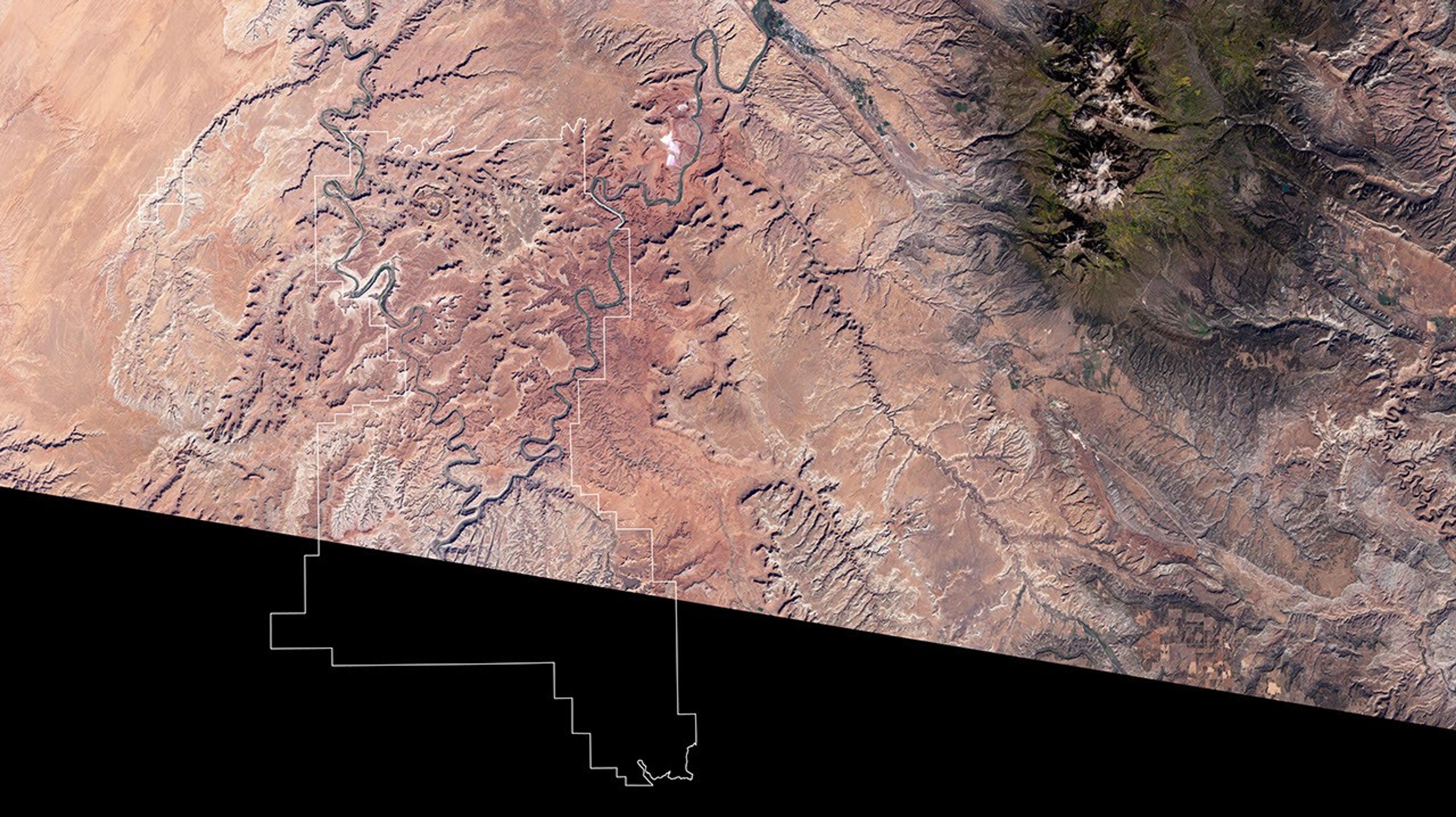 Canyonlands National Park in Utah encompasses some of the most remote and rugged terrain in the continental United States. The topography is so irregular that the Park’s three main districts—Island in the Sky, the Needles, and the Maze—are not accessible from one another by paved roads. This true-color satellite image from the Enhanced Thematic Mapper plus (ETM+) sensor on the Landsat-7 satellite shows the Island in the Sky, a large mesa bordered by the Green and Colorado Rivers. Vegetation is sparse in the Southwest’s arid climate, revealing a landscape of brightly-colored rock.