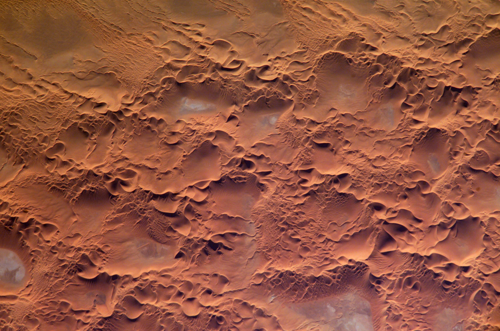 The most common landforms in the image are star dunes and barchan (or crescent) dunes. Small linear dunes appear at top left. Star dunes are formed when sand is transported from variable wind directions, whereas barchan dunes form in a single dominant wind regime. The superimposition of two dune types suggests that wind regimes have changed through time. The active nature of this portion of the Erg is well illustrated by this image—smaller dunes form and migrate along the flanks of the larger dunes and sand ridges. Occasional precipitation fills basins formed by the dunes; as the water evaporates, salt deposits are left behind which appear as bluish-white areas.