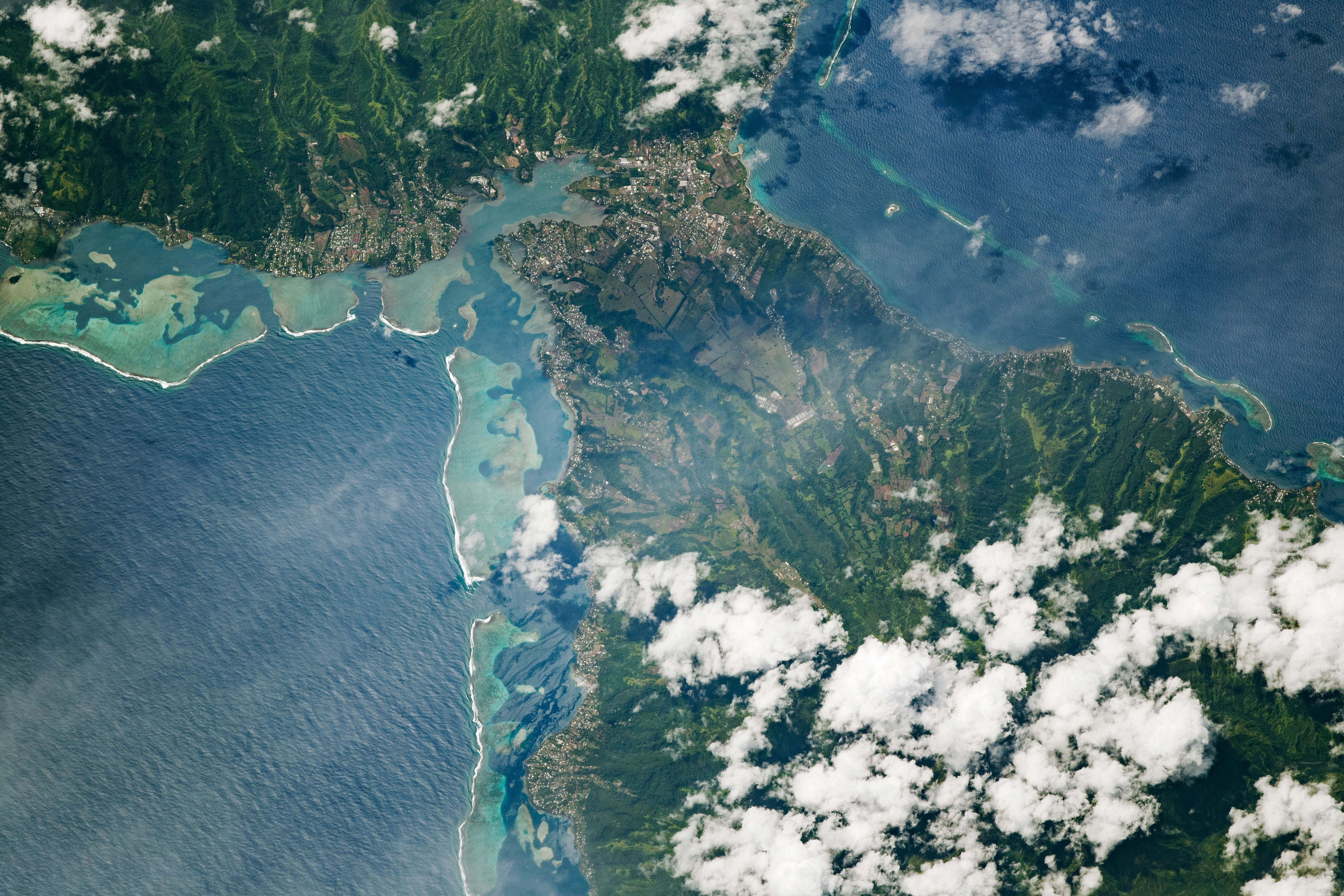 This photograph, taken by an astronaut onboard the International Space Station, provides a glimpse of the settlements along the shores of the coral reef-ringed island of Tahiti. Pictured here is the Isthmus of Taravao, a narrow strip of land that connects the two ancient volcanoes—Tahiti-Nui and Tahiti-Iti—and the villages that line the coast.