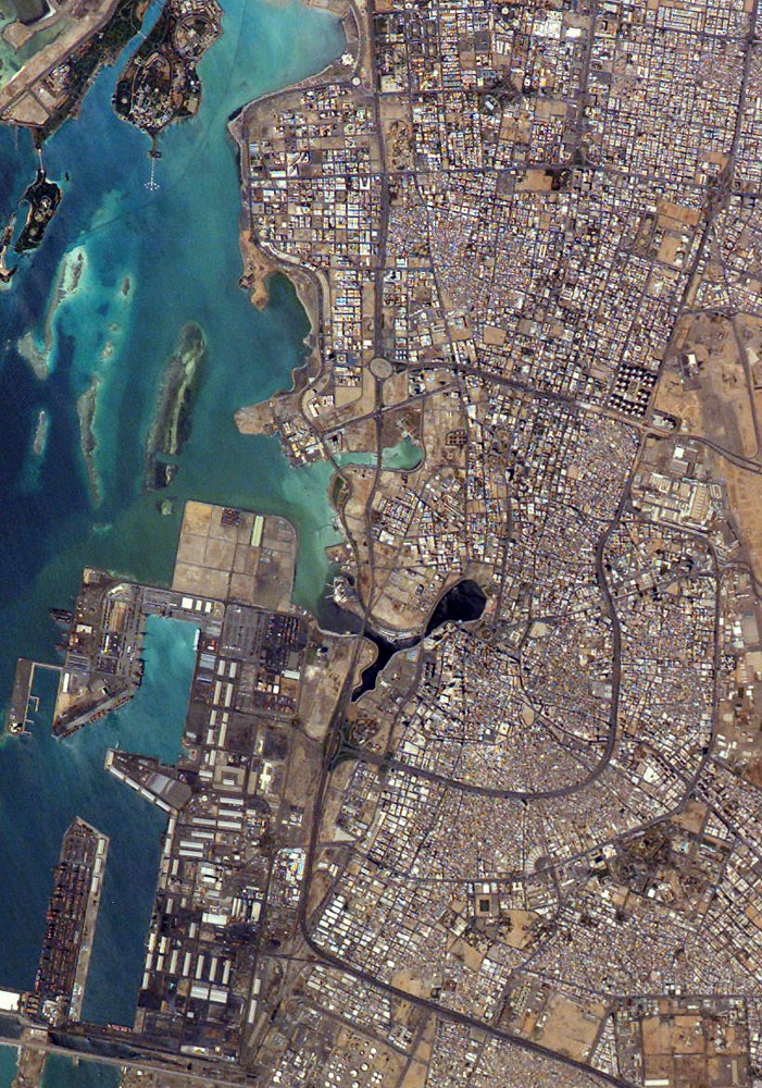 The city of Jeddah is the second largest city in Saudi Arabia (after Riyadh), and is the country’s most important Red Sea port. A large warehouse and dock complex is visible in the lower left portion of this astronaut photograph. Apart from being a major port for exchange of goods with Africa and Europe, Jeddah is of great importance for Islamic pilgrims going east to Mecca (a religious journey known as the hajj). Tradition also places the final resting place of the Biblical Eve in Jeddah, although the tomb was destroyed over fifty years ago. Due to a steady influx of travelers, the city contains many hotels, resorts, shopping centers, and other attractions. One such apartment complex, comprised of multiple high-rise buildings, is visible in the right of the image.