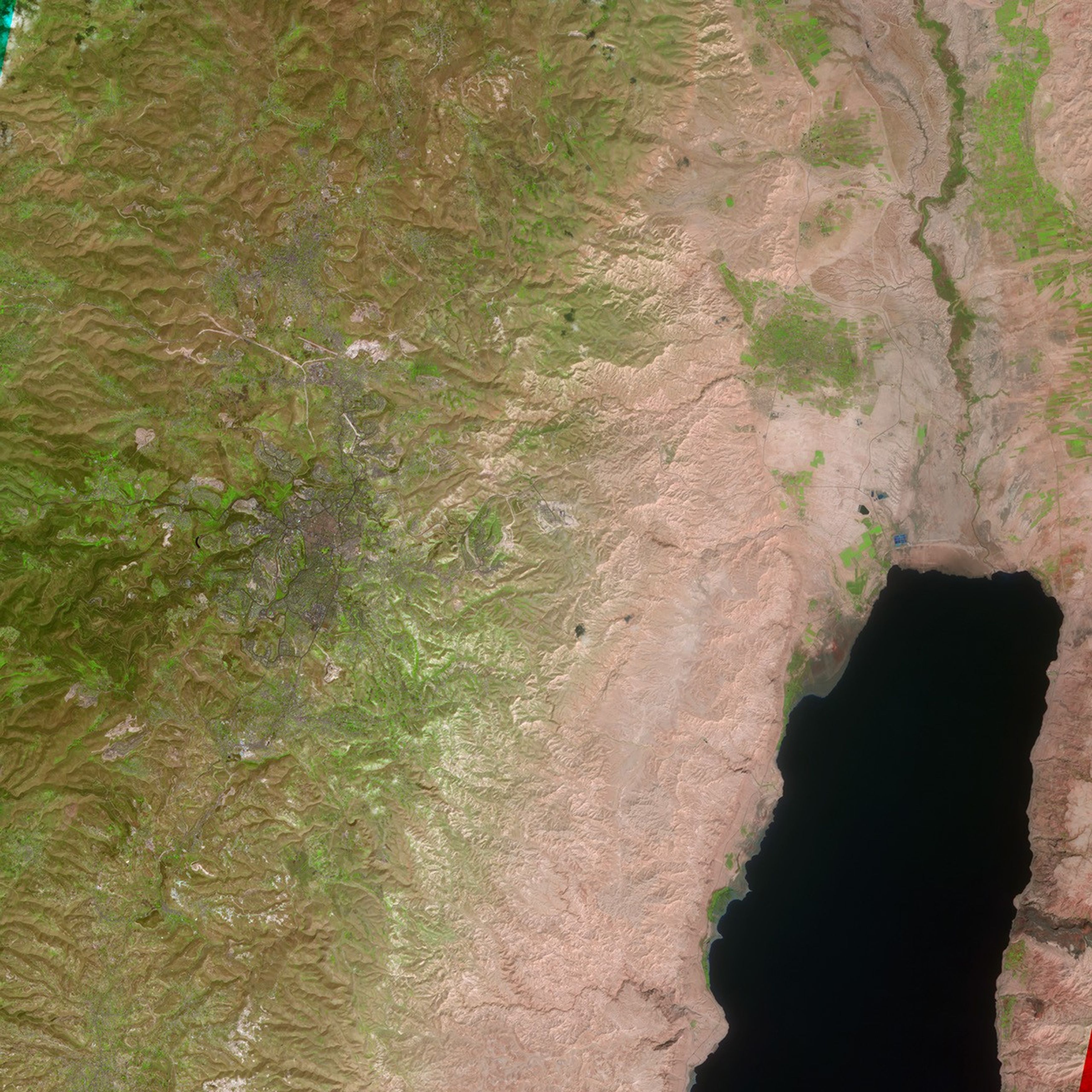 The ancient city of Jerusalem is cloaked in shades of purple in this image based on data acquired by the Advanced Spaceborne Thermal Emission and Reflection Radiometer (ASTER) on NASA’s Terra satellite on April 3, 2000. Using shortwave infrared, infrared, and red wavelengths (ASTER bands 4, 3, and 2) in the traditional red, green, and blue channels of the image creates this false-color version of the city in which developed areas are purple, vegetation is green, water is deep blue or black, and naturally bare (or thinly vegetated) ground is pinkish-brown.