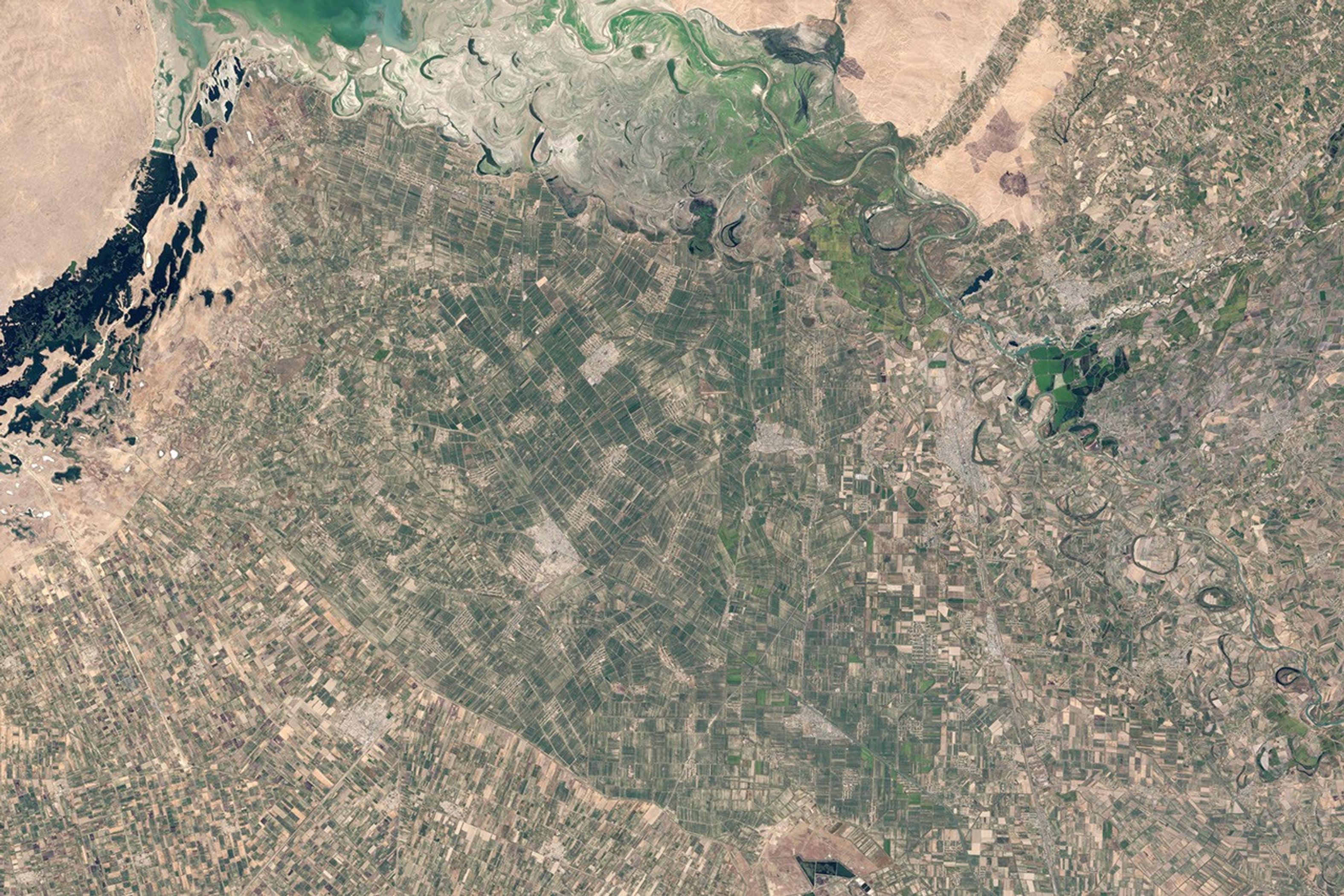 Through this flat, cultivated region, the Syr Darya River takes a meandering path, looping east and west. Evidence of former river wanderings appear in the oxbow lakes lining the river. When a meandering river takes a shortcut, the longer path it used to follow becomes isolated. The result is a semicircular water body that testifies to the river’s past.