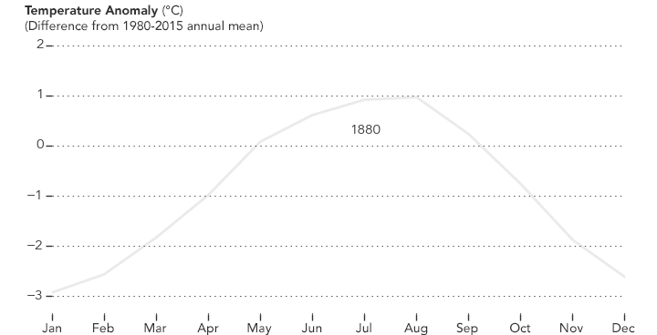 The animated figure above shows global temperature anomalies for every month since 1880, a result of the Modern-Era Retrospective analysis for Research and Applications, version 2 (MERRA-2) model run by NASA’s Global Modeling and Assimilation Office. Each line shows how much the global monthly temperature was above or below the annual global mean from 1980–2015. Note how monthly temperature anomalies rise over the 136-year record.