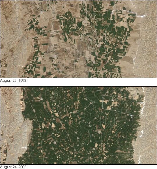 These Landsat images compare the amount of irrigated cotton grown in the Harran Plains of southeastern Turkey in 1993 versus 2002. In the 1993, before the completion of the first tunnel, the water available for irrigation came from deep bore holes, which supported only localized crop production. By 2002, irrigation water was coming almost entirely from the Ataturk Dam and Reservoir. Irrigated cotton area grew by more than 50 percent during the nine-year period, bringing an additional 450,000 acres under cultivation. Although the hot, dry weather of late August has left the surrounding landscape parched and dusty, the Harran Plains are thick with green cotton plants in the image from 2002.