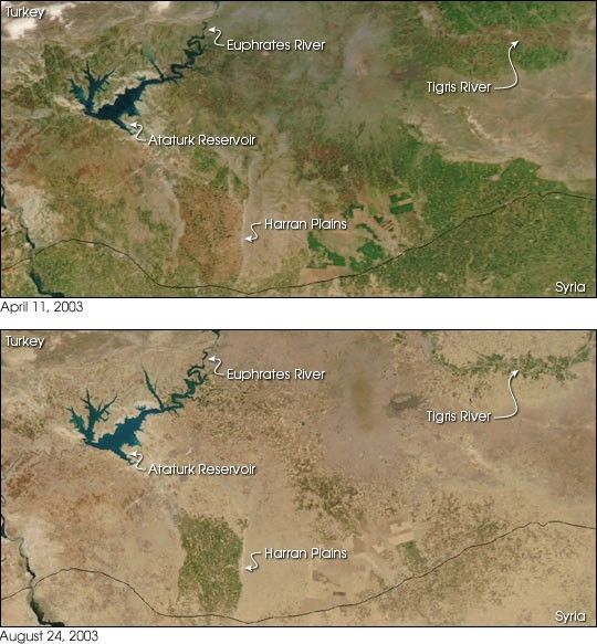 On a wider scale than the Landsat images, these MODIS images show the contrast in vegetation at the end of the winter rains in April compared to the dry summer month of August. Green vegetation in the April image indicates rain-fed grain crops, while green vegetation in the August image shows where irrigated crops are grown downstream from the major reservoirs along the Euphrates River. The Ataturk Reservoir of Turkey is the reservoir located to the north, and the Assad Reservoir of Syria is located further downstream.