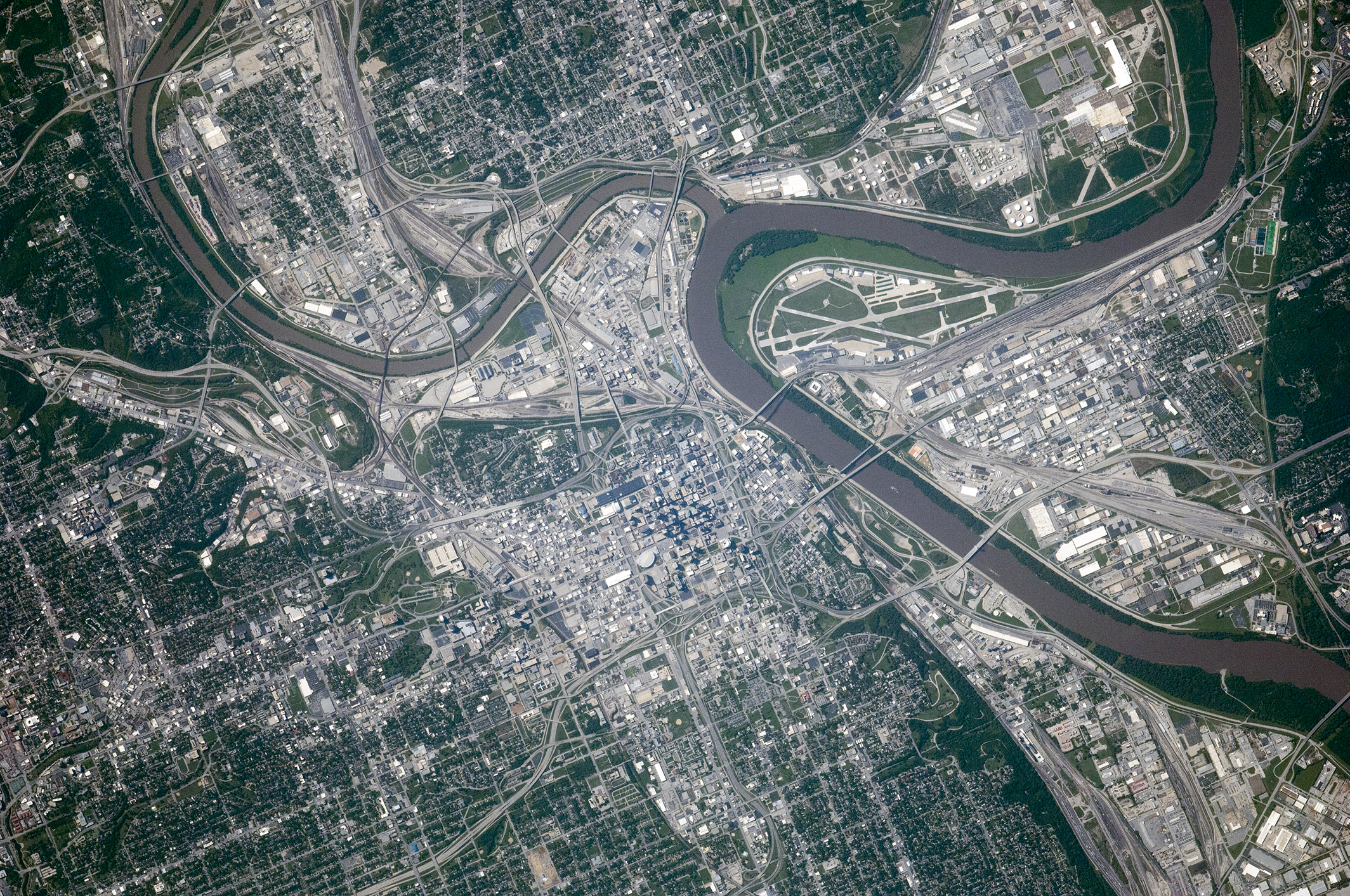 The Missouri and Kansas rivers meet in this space-based view of the Kansas City metropolitan area, photographed on September 6, 2014, by astronauts on the International Space Station. Portions of the Missouri River and State Line Road trace the boundary between the states of Kansas and Missouri. (Note that north is to the upper right.)