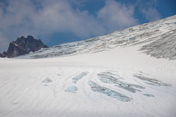 The team hiked up the water-saturated ice under hazy skies, laced with smoke from nearby wildfires. Mauri paused to take stock of the conditions. “We’re at about 6,300 feet (1,900 meters) of elevation,” he said. “Usually this slope has 2 to 5 feet (60 to 150 centimeters) of snow on it in early August, and obviously it has no snow this year. Even in bad years, it used to have some snow.”
