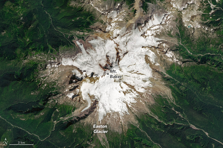 In the depths of winter, a blanket of snow accumulates on top of glaciers. When warm weather arrives, the covering of snow begins to melt off, first at lower elevations and then reaching higher up the slope. As last winter’s snow melts away, it reveals old, bare ice that is darkened with sediment and jagged with crevasses. Once this ice is exposed to the summer sunshine, the glacier begins to melt in earnest. Patches of bare ice are visible in this photo of Easton Glacier (below), taken in August 2024.