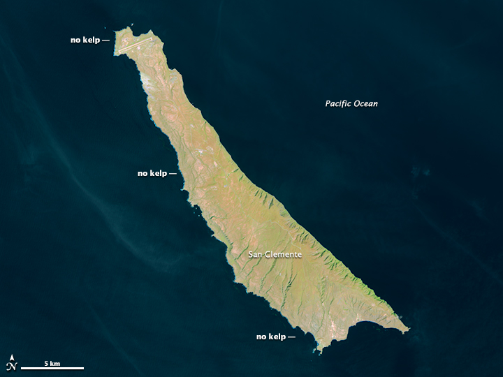 The images above were captured by the Operational Land Imager on the Landsat 8 satellite on December 23, 2013, and March 29, 2014. They show the state of kelp forests along San Clemente, one of the Channel Islands off the southern California coast. On March 1, 2014, extreme storm-provoked waves (up to 5.5 meters, or 18 feet) pounded the western side of the island. Those waves decimated the giant kelp communities, leaving just a few sparse patches still visible in the March 29 image.