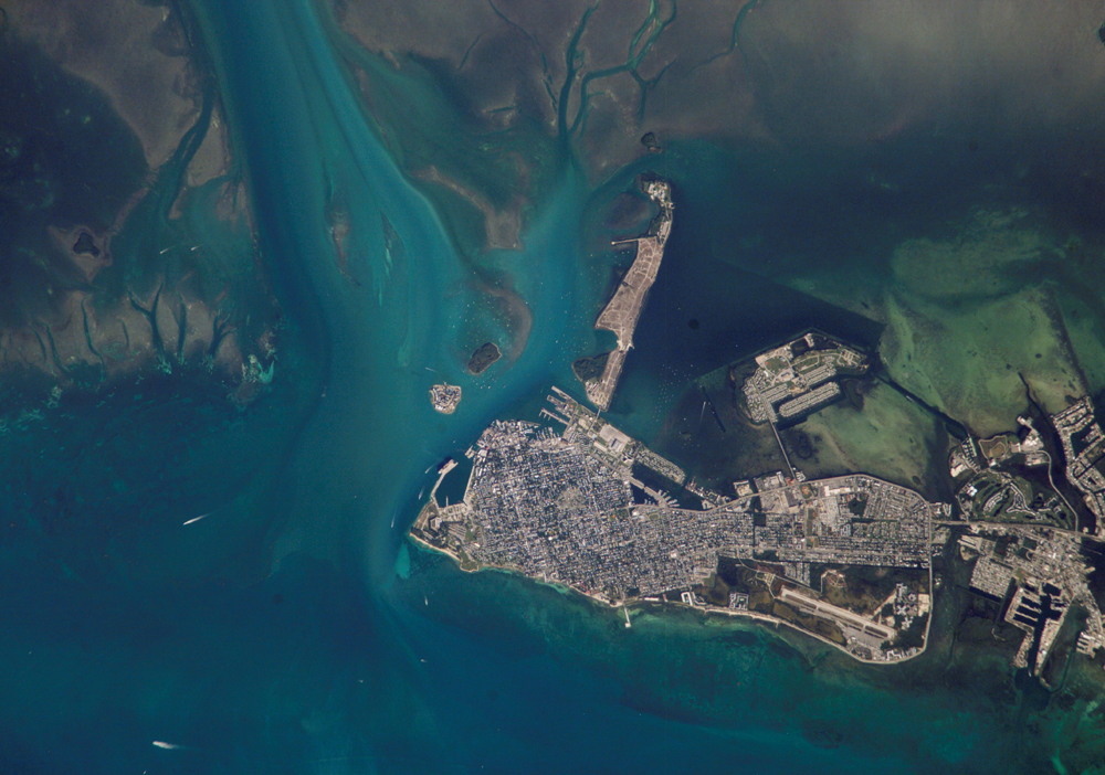 Turquoise blue waters, coral reefs and sandy beaches were apparently on the minds of International Space Station astronauts last week. As they passed over the Florida Keys, they acquired a sequence of images from Key West eastward along the outer keys. The detail of the images showcases the clarity of the Caribbean waters, and allows for mapping of both land use and shallow marine features. This image of Key West shows the intensive built-up area of the town, the offshore sand flats and grassbeds surrounding Key West, the patterns of natural tidal channels and artificially dredged channels that allow boat access to the local marinas.