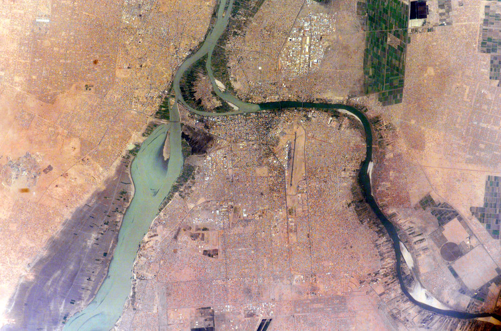 Sudan’s capital city, Khartoum, translates as “Elephant’s Trunk.” The name describes the shape of the Nile where the Blue and the White Nile Rivers unite to form the single Nile River that flows northward into Egypt. This image shows the rivers near the end of the dry season.