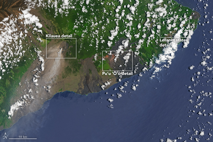 At 10:41 a.m. local time (20:41 Universal Time) on May 14, 2018, the Operational Land Imager (OLI) on Landsat 8 acquired a natural-color image of the volcano. Information from the shortwave infrared (band 7) has been layered onto the image to show where the satellite detected unusually warm temperatures (red) associated with lava. Recent lava flows appear gray; forested areas are dark green. Homes appear as small white dots.
