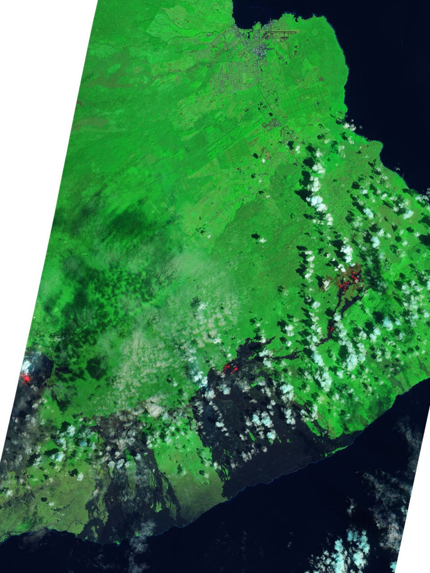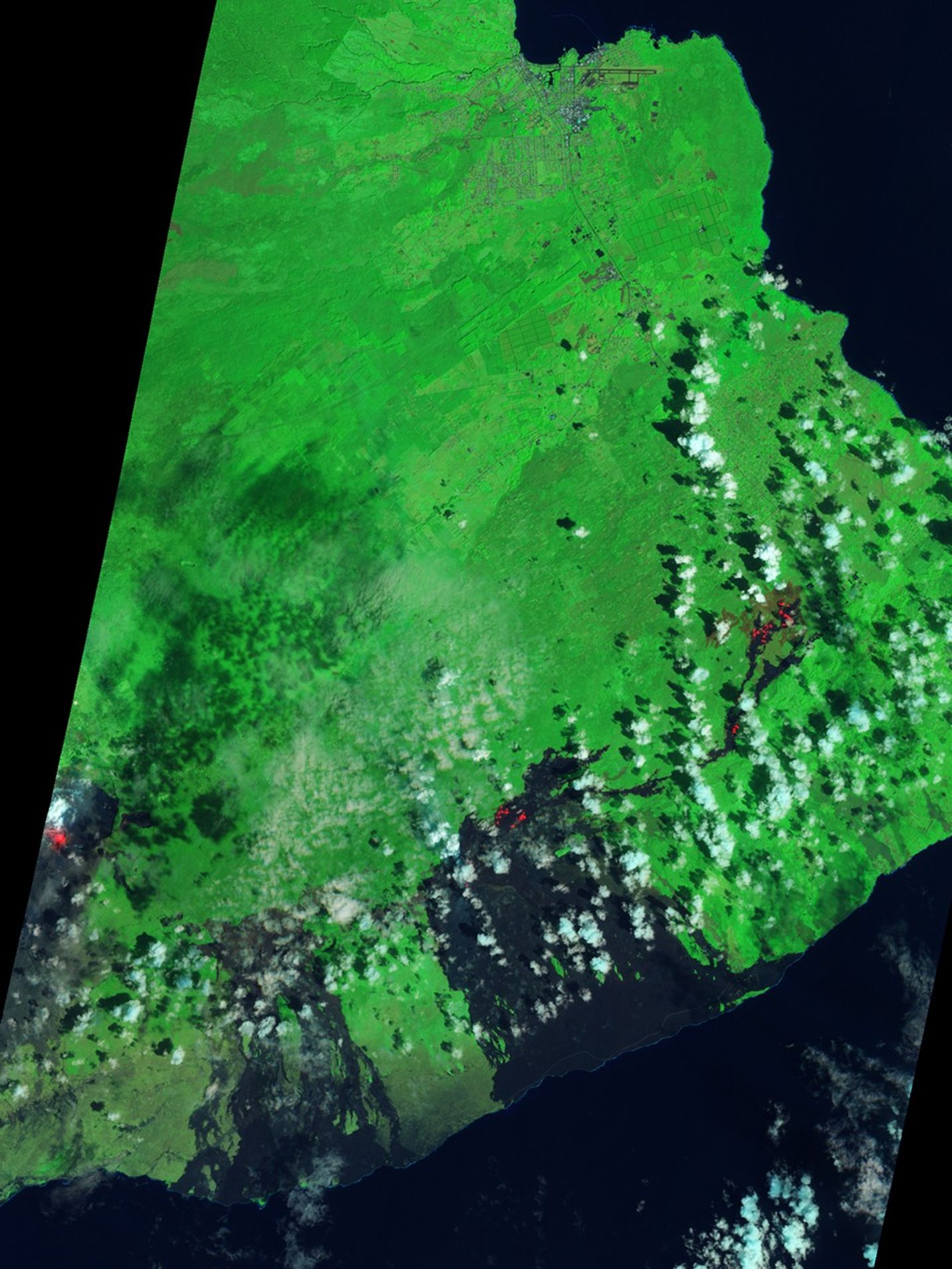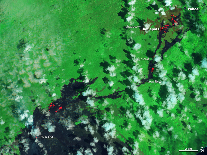 The ALI image combines shortwave infrared, near infrared, and green light. Since the hot surfaces of active flows radiate shortwave infrared light, they appear red. Vegetation appears light green. Rocky lava flows—up to 50 years old, too young for significant regrowth of vegetation—are black. Popcorn clouds, which are white with a tinge of blue, are scattered throughout the scene.