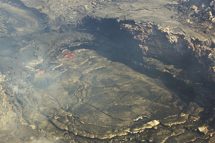 On February 27, 2015, the Hawaiian Volcano Observatory published the two photographs below. The top image, captured during an aerial survey, shows a depression within Pu‘u ‘O’o crater. The depression formed following the start of the June 27th lava flow. The lower images shows fresh pahoehoe lava on the north flank of Pu‘u ‘O’o.