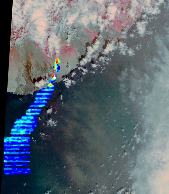 Kilauea Volcano, on the Island of Hawaii, has been in a constant state of eruption since January 3, 1983. The Pu'u O'o vent, formed soon after the onset of this eruption, is a persistent source of sulfur dioxide gas emissions. Changes in the rate of sulfur dioxide emission from a volcano can signal an impending eruption, and volcanologists attempt to measure emission rates with a variety of techniques. On the eve of the 20th anniversary of the eruption of Kilauea, we present a map of the Pu'u O'o sulfur dioxide plume derived from ASTER data. The map, produced from ASTER's thermal infrared channels, depicts color-coded concentrations superposed onto a false-color composite of ASTER's visible and near infrared channels. High sulfur dioxide concentrations are colored white, lower concentrations are red, orange, yellow, green and blue. ASTER is the only instrument in orbit that can detect passive venting of sulfur dioxide in plumes as small as the Pu'u O'o plume (typically less than 1.5 km wide over land). This capability is essential if we are to monitor sulfur dioxide emissions from space.