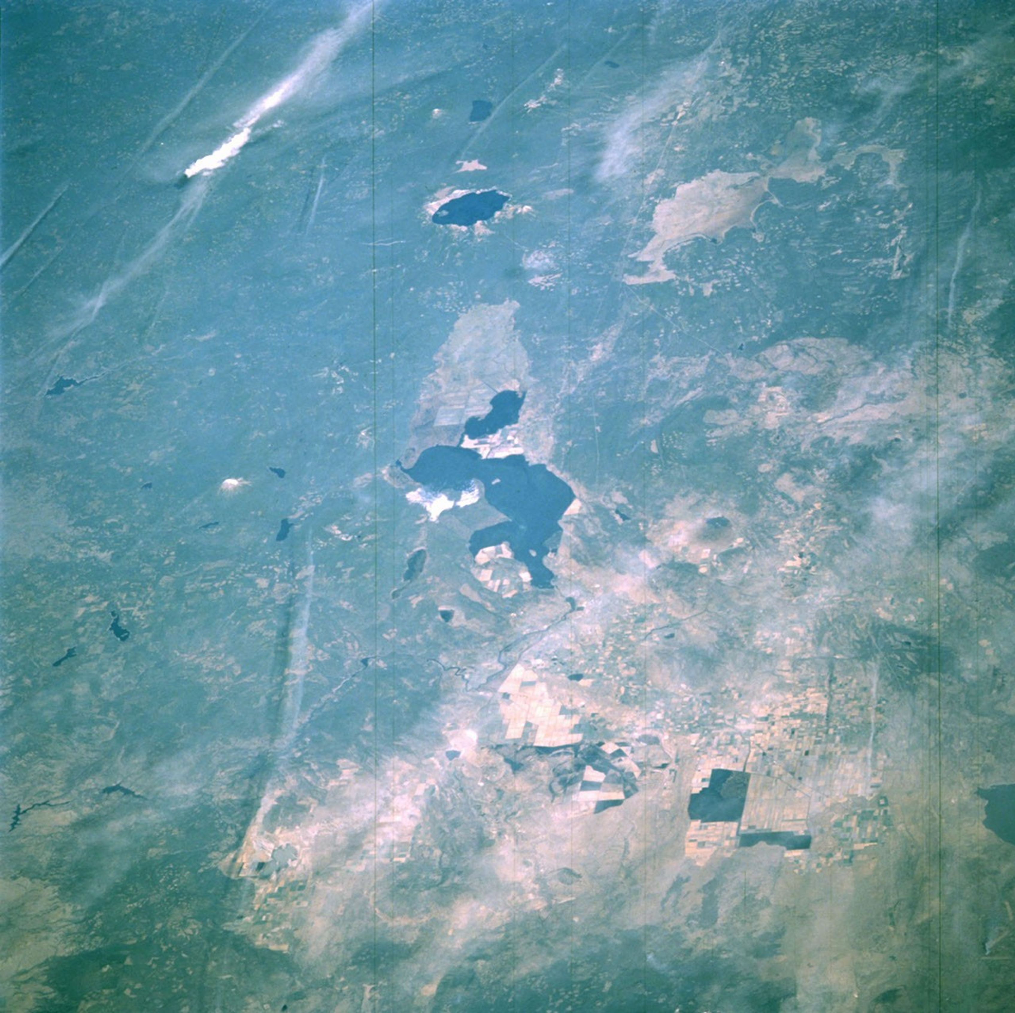 This image (STS058-85-74) shows the Klamath Basin in October 1993, as photographed by astronauts aboard the Space Shuttle. This year featured relatively normal conditions, although it followed immediately after a series of drought years. The larger square areas represent management units on the wildlife refuges; darker areas in the units are flooded. The smaller square areas are fields of irrigated agriculture.References & Resources
