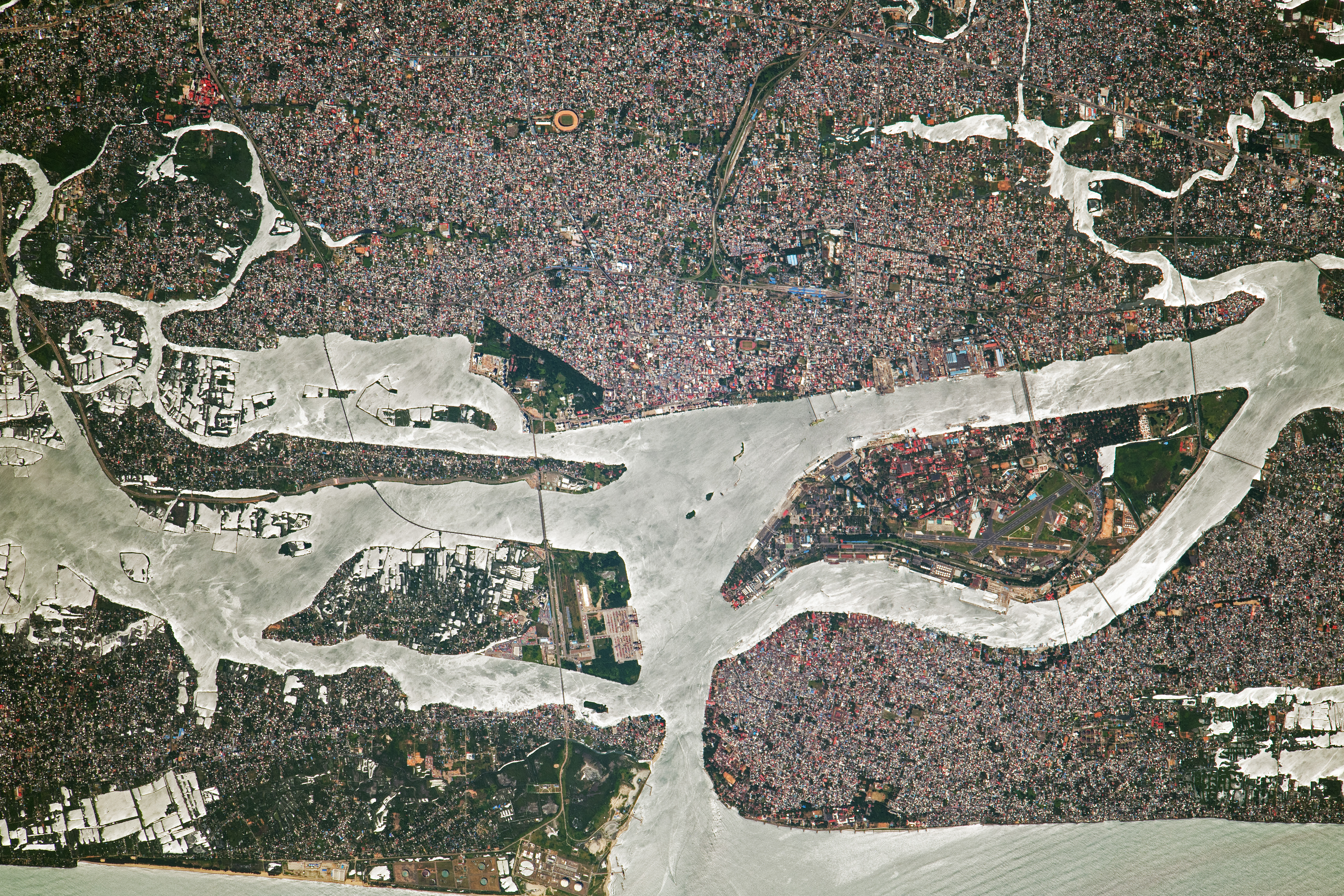 The city of Kochi (also known as Cochin) is nestled between the Arabian Sea and rivers flowing toward the ocean. Extensive infrastructure including housing, refineries, and stadiums cover areas along the coast and inland across the Ernakulam district. The extent of land modification is further highlighted by Willingdon Island, an artificial island that serves as a naval base and port to the city.