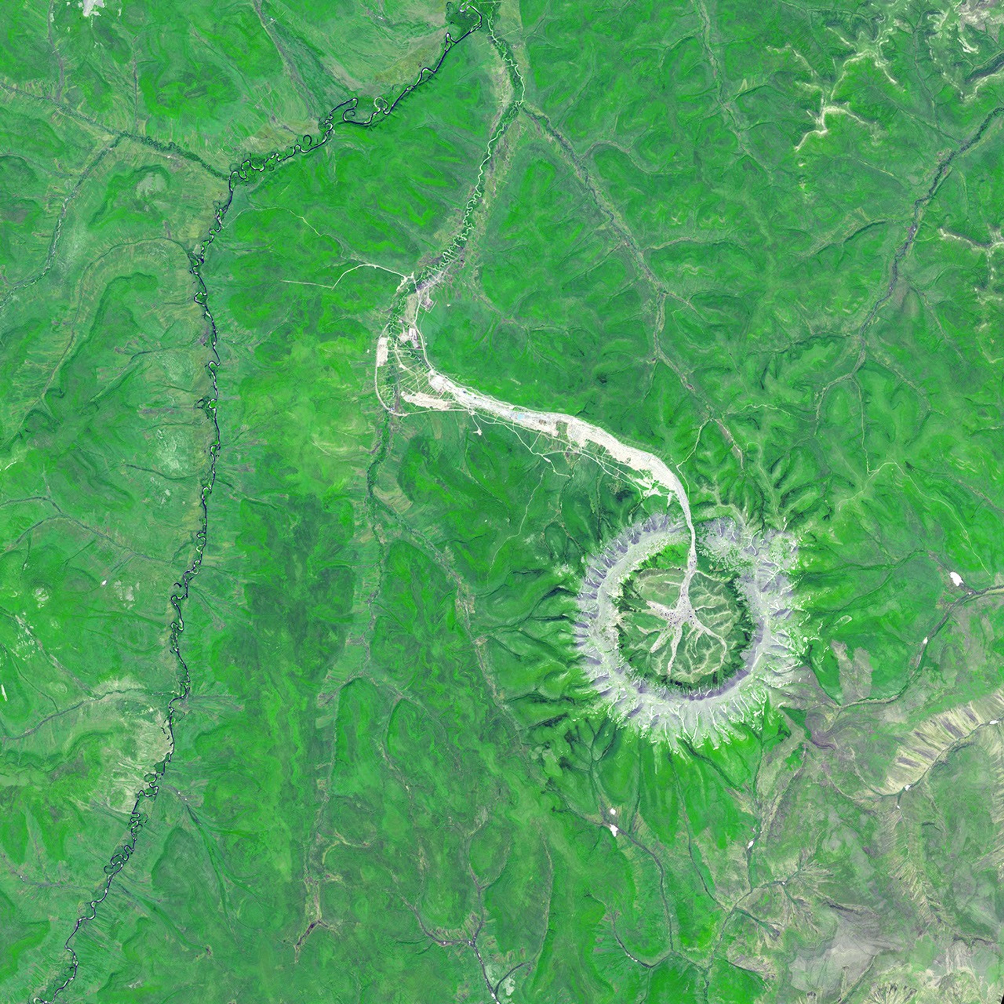 In eastern Siberia, a perfect circle of rock contrasts with the surrounding topography. The 6-kilometer- (3.7-mile-) wide ring looks like an impact crater, or the caldera of an extinct volcano, but it is neither. Kondyor Massif was formed by the intrusion of igneous, or volcanic, rock that pushed up through overlying layers of sedimentary rock, some of them laid down more than a billion years ago.