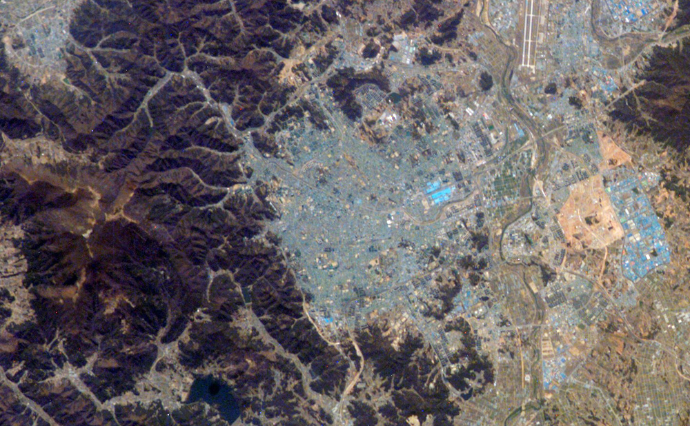 The most notable feature in this astronaut photograph is an interesting blue cast to the urbanized regions. Digital astronaut photographs capture the same red, green, and blue wavelengths of reflected light that human eyes are sensitive to (known as a “true-color” image), and urban areas typically appear in tones of grey in such images. The distinctive blue-grey color of the Kwangju metropolitan area is the result of numerous blue rooftops, present on both small residential buildings (not visible at the image resolution) and large industrial buildings such as those located at image center and image right. High-resolution imagery of the rooftops (not shown) suggests that the blue color is the result of painting rather than an intrinsic characteristic of the building material.
