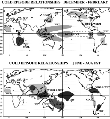 Changes in global atmospheric circulation patterns accompany La Niña and are responsible for weather extremes in various parts of the world that are typically opposite to those associated with El Niño. These patterns result from colder than normal ocean temperatures inhibiting the formation of rain-producing clouds over the eastern equatorial Pacific region while at the same time enhancing rainfall over the western equatorial Pacific region (Indonesia, Malaysia and northern Australia.) These patterns affect the position and intensity (weakening) of jet streams and the behavior of storms outside of the tropics in both the Northern and Southern hemispheres.