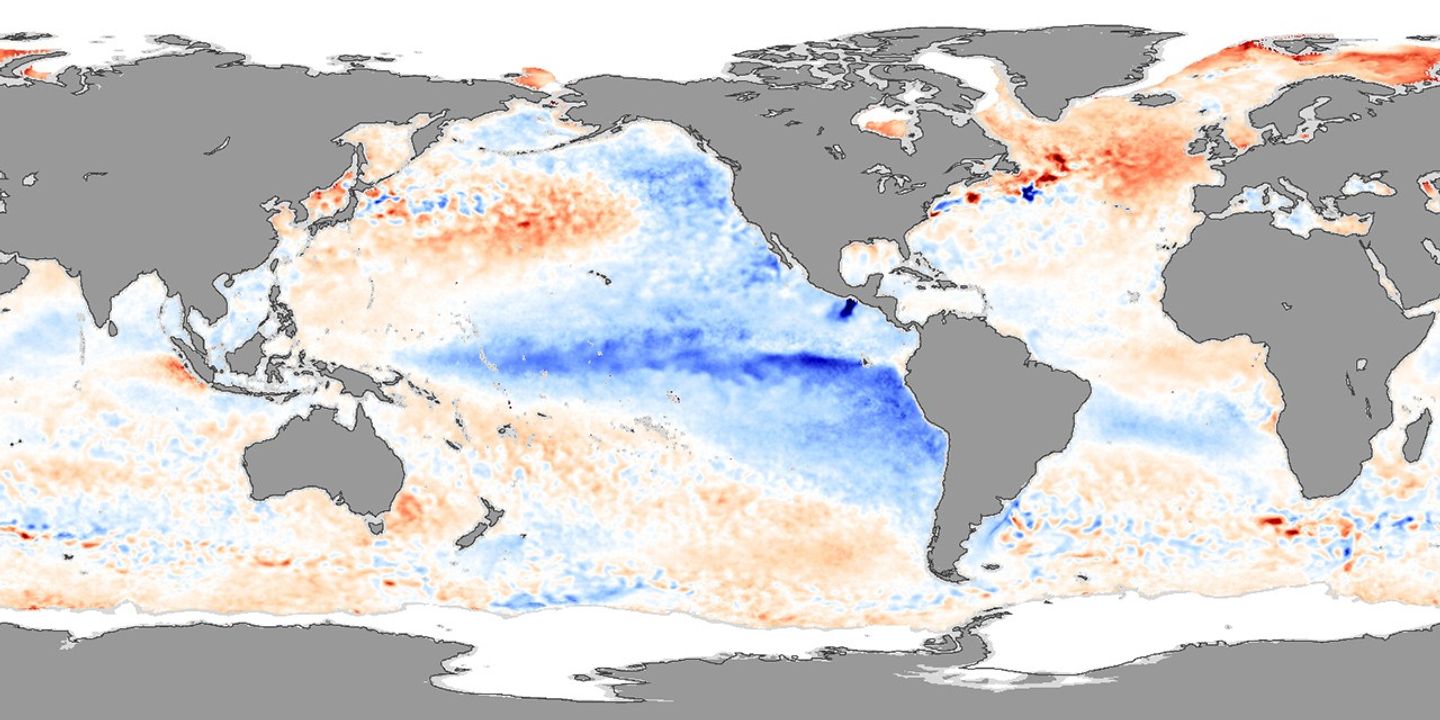 During La Niña, sea surface temperatures in the eastern tropical Pacific are below average, and temperatures in the western tropical Pacific are above average. This pattern is evident in this temperature anomaly image for November 2007. This image shows the temperature for the top millimeter of the ocean’s surface—the skin temperature—for November 2007 compared to the long-term average. A strong band of blue (cool) water appears along the Equator, particularly strong near South America. Orange to red (warm) conditions appear north and south of this strong blue band. The 2007 data were collected by the Advanced Microwave Scanning Radiometer (AMSR-E) flying on NASA’s Aqua satellite. The long-term average is based on data from a series of sensors that flew on NOAA Pathfinder satellites from 1985 to 1997.