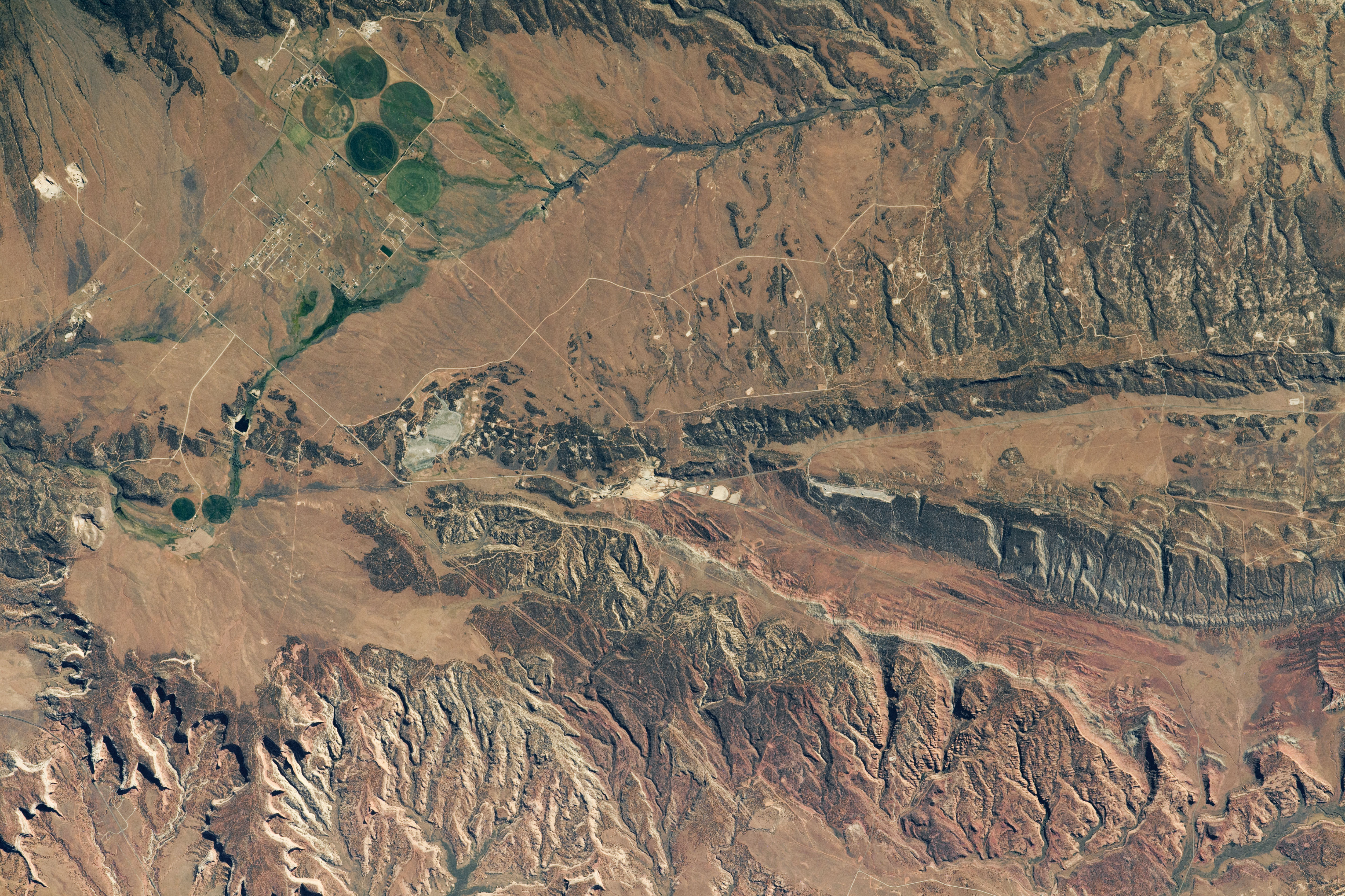 This photograph, taken from the International Space Station by an astronaut, illustrates the influence of human exploration both on and below the land surface near the La Sal Mountains in eastern Utah.