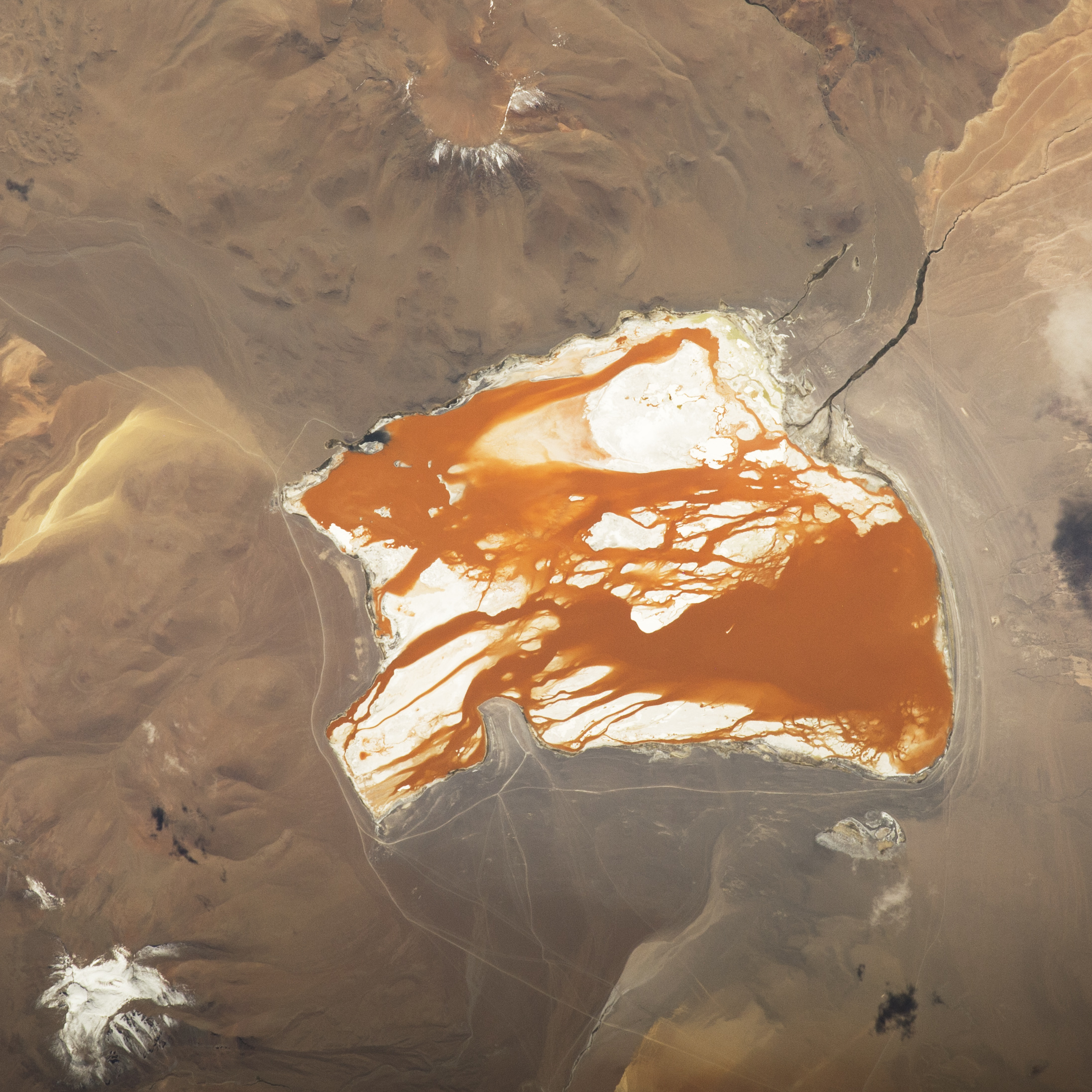 An astronaut aboard the International Space Station took this photograph of the brightly colored Laguna Colorada in the Bolivian Andes Mountains. The lack of atmospheric haze at high altitude—the lake sits 4,300 meters above sea level (14,100 feet)—helps make images of the region especially clear.