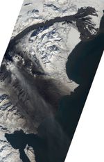 On April 4, 2009, the Advanced Land Imager (ALI) on NASA’s Earth Observing-1 satellite captured this image of the Drift River Valley where it connects with Cook Inlet. Lahars have stained the river valley a deep muddy brown. Water channels form branching patterns just west of the Cook Inlet shore, and the dark brown color of each water channel contrasts sharply with the nearby snow. The Drift River Oil Terminal resides in this network of channels, and part of the facility appears as an off-white rectangle in a landscape of meandering mudflows. The same day that ALI acquired this image, the Alaska Volcano Observatory reported that a lahar had developed in the Drift River Valley, as indicated by seismometer readings. Lahars had also been recorded in the Drift River Valley during the previous weeks.