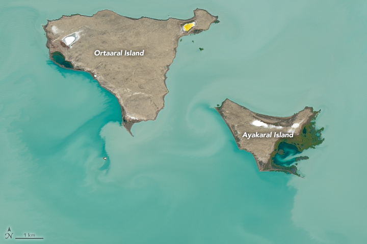 If you were to cruise in a boat in the main part of the lake, you could count 43 islands with a total area of 66 square kilometers, according to Zhanna Tilekova of Kazakh National Technical University, who has published research on the region’s geoecology. However, those numbers can change. Tilekova noted that as water levels decline, new islands form and the area of existing islands grows. In the western part of the lake, Tasaral (north of this image) and Basaral islands are the largest. Ortaaral and Ayakaral islands are also relatively large (see the detailed image). Vegetation, likely small brown shrubs (Saxaul), can grow on these islands. The white areas are likely salt pans.