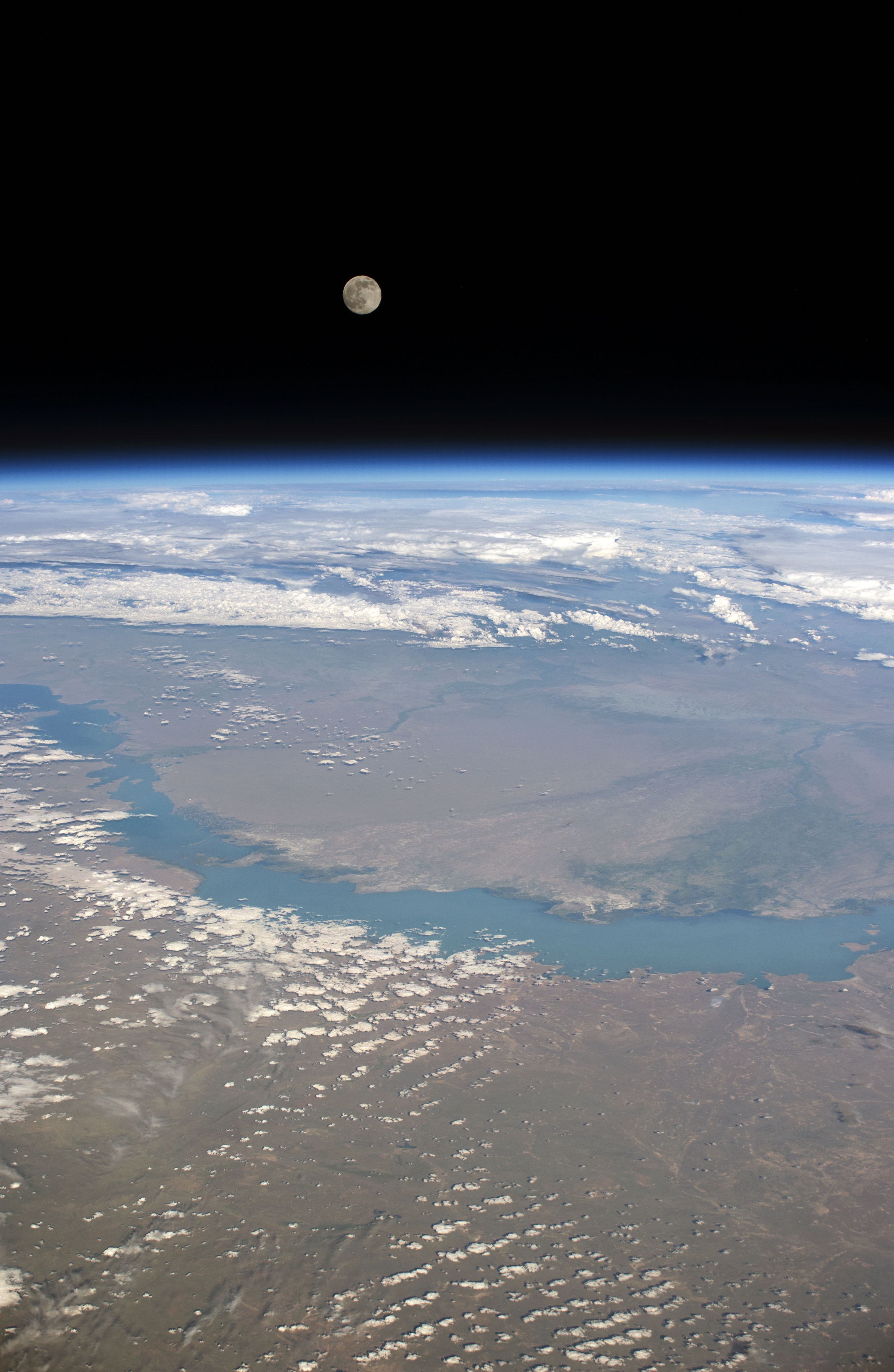 Set against the darkness of space, the Moon appears to hover over the landscape. Astronauts on the ISS see the same lunar phases as we do on the ground. The steep color gradient in the upper third of the photo marks the edge of Earth’s atmosphere and is known as the limb. The Moon does not have a gradually darkening limb because it lacks an atmosphere; the lunar limb appears simply as a sharp demarcation between the surface and the darkness of space.