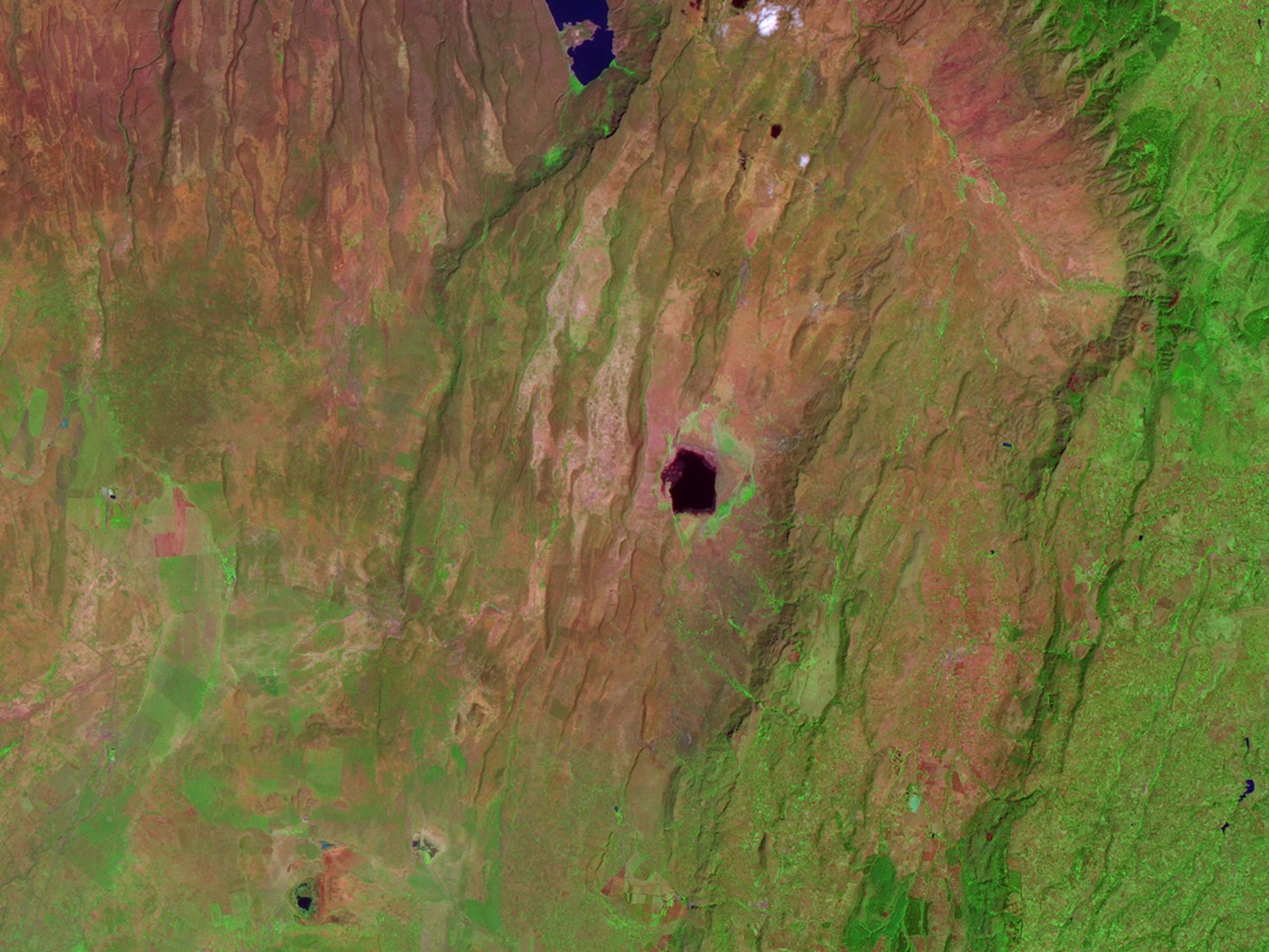 This simulated natural-color image from the Advanced Spaceborne Thermal Emission and Reflection Radiometers (ASTER) on NASA’s Terra satellite on December 18, 2002, shows the area south of Lake Bogoria in Kenya. The lake is narrow and shallow, and high rates of evaporation make the water salty. Vegetation (bright green) in the area is relatively sparse, outlining moister ridges and slopes. Cultivated vegetation also occurs, recognizable especially along rivers and near lakes by geometric patterns and sharp boundaries. Bare, rocky ground appears pinkish tan. The darker blue-black spot below and left of image center is another lake. The difference in color between that lake and Lake Bogoria may be due to differences in depth, clarity, or minerals in the water.