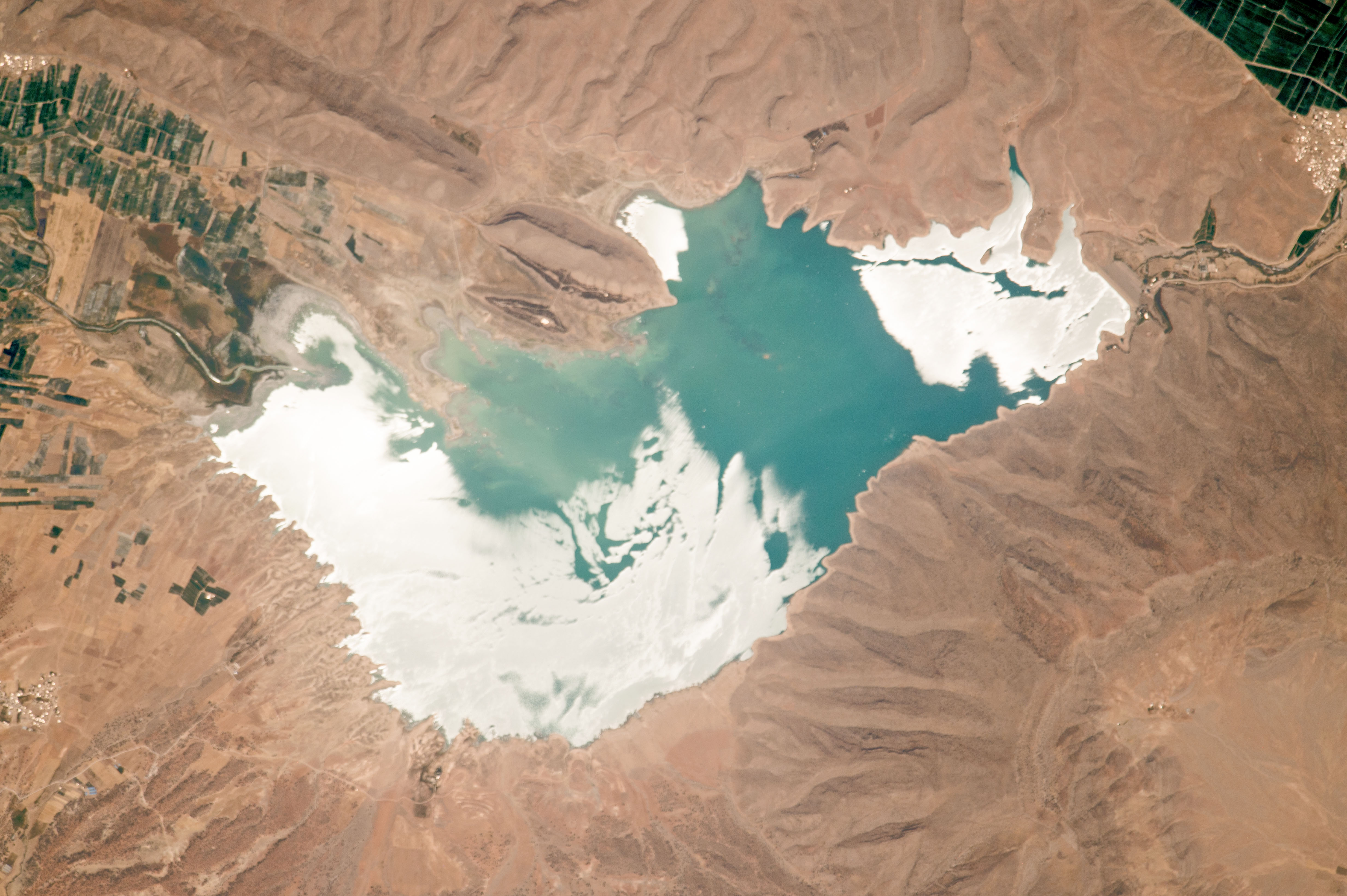 An astronaut aboard the International Space Station (ISS) focused a camera lens on a brilliant spot in Iran: the sun reflecting off Darodzan Lake. This waterbody in the desert, surrounded by the Zagros Mountains, is impounded behind a dam wall just upstream of the town of Darodzan.
