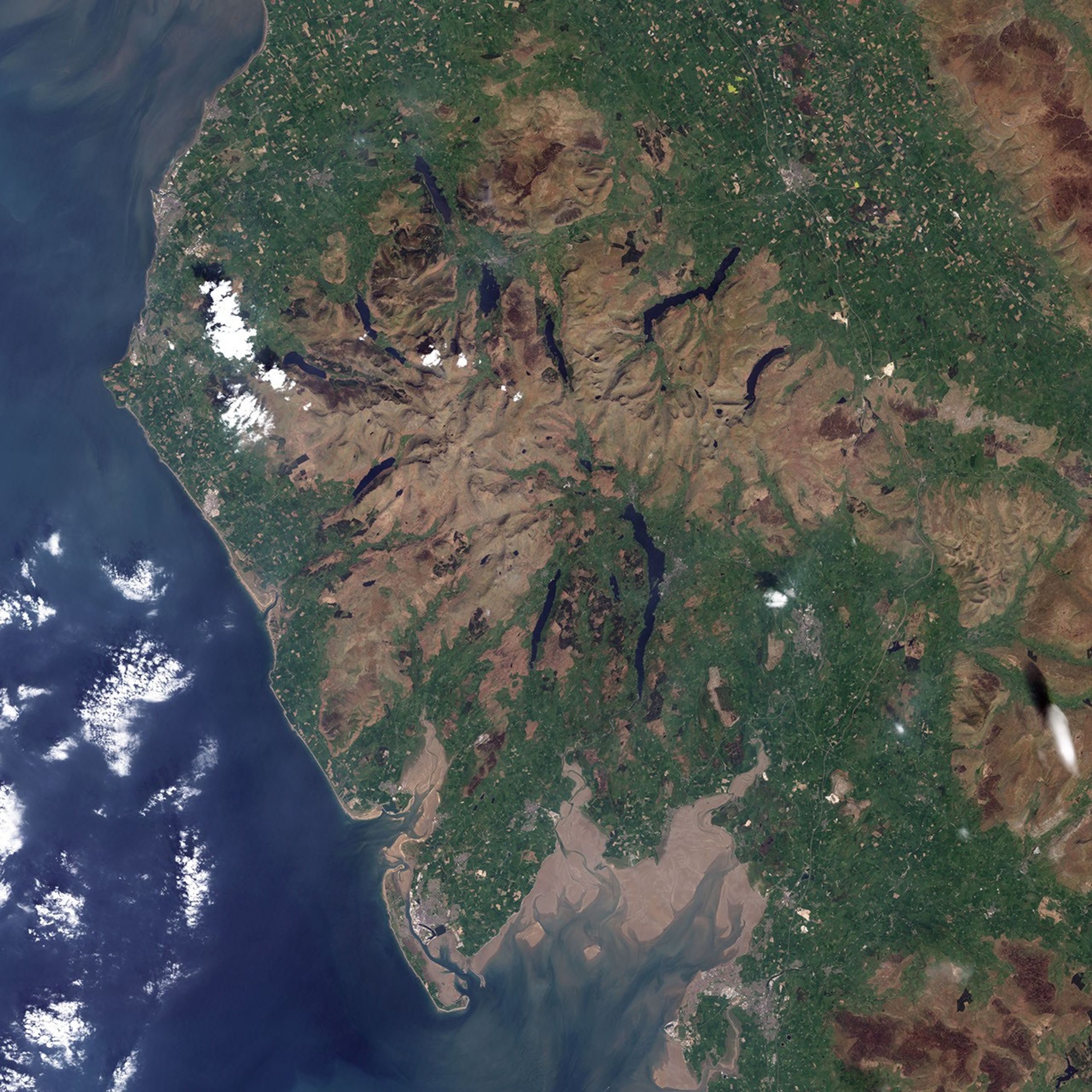 The Enhanced Thematic Mapper on NASA’s Landsat 7 satellite captured this natural-color image of the Lake District National Park on May 7, 2000. Earth-toned crags rise above lower-lying lands carpeted with green. Like scratch marks from giant claws, the long, twisted lakes generally radiate outward from the center of the park.
