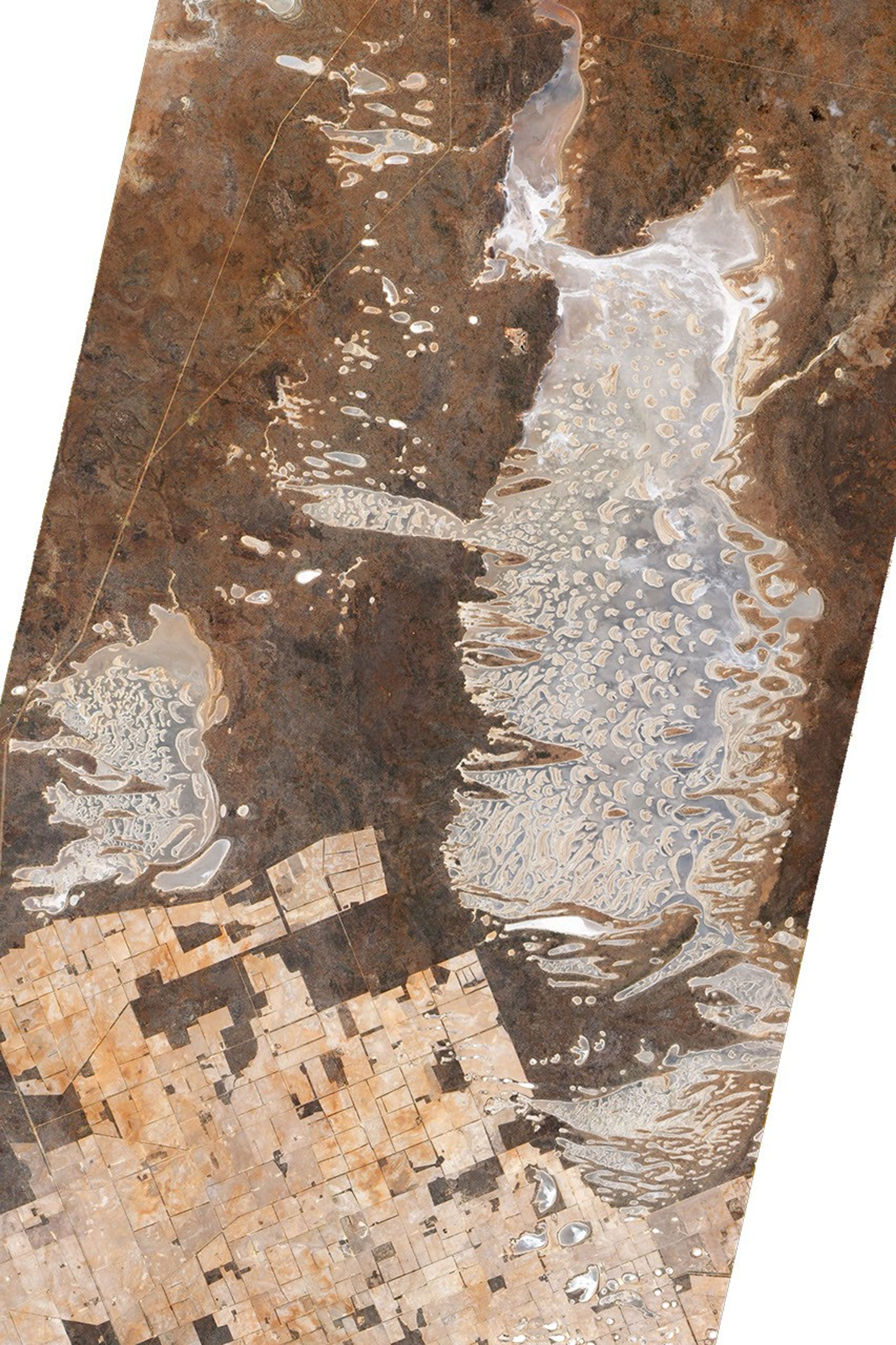 Southwest of the lake (image upper left) are agricultural fields, identifiable by their neat, straight borders. The contour of the lake, in contrast, is wildly uneven, with long stretches of dry land poking into the lake from the east and west. Dry, arid climates are the norm in many parts of Australia, and sparse rainfall leaves this lake shallow and salty, especially in the summertime.