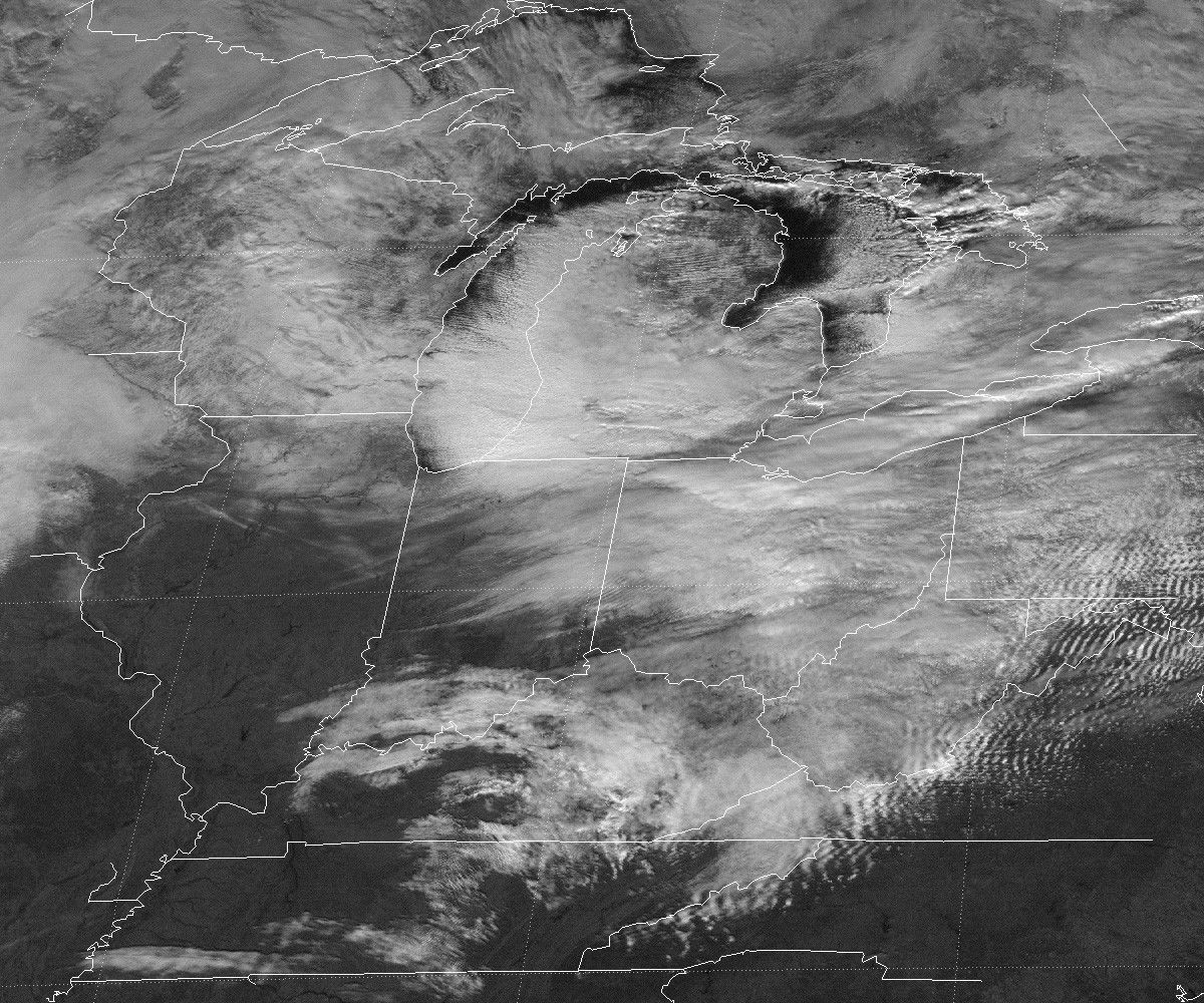 This image was acquired by the Geostationary Operational Environmental Satellite (GOES), operated by NOAA, on December 27, 2001, at 12:32 p.m. EST. The scene shows thick bands of clouds extending from the eastern tip of Lake Erie and over Buffalo. The arrows show the wind direction, which is blowing down the length of the lake.