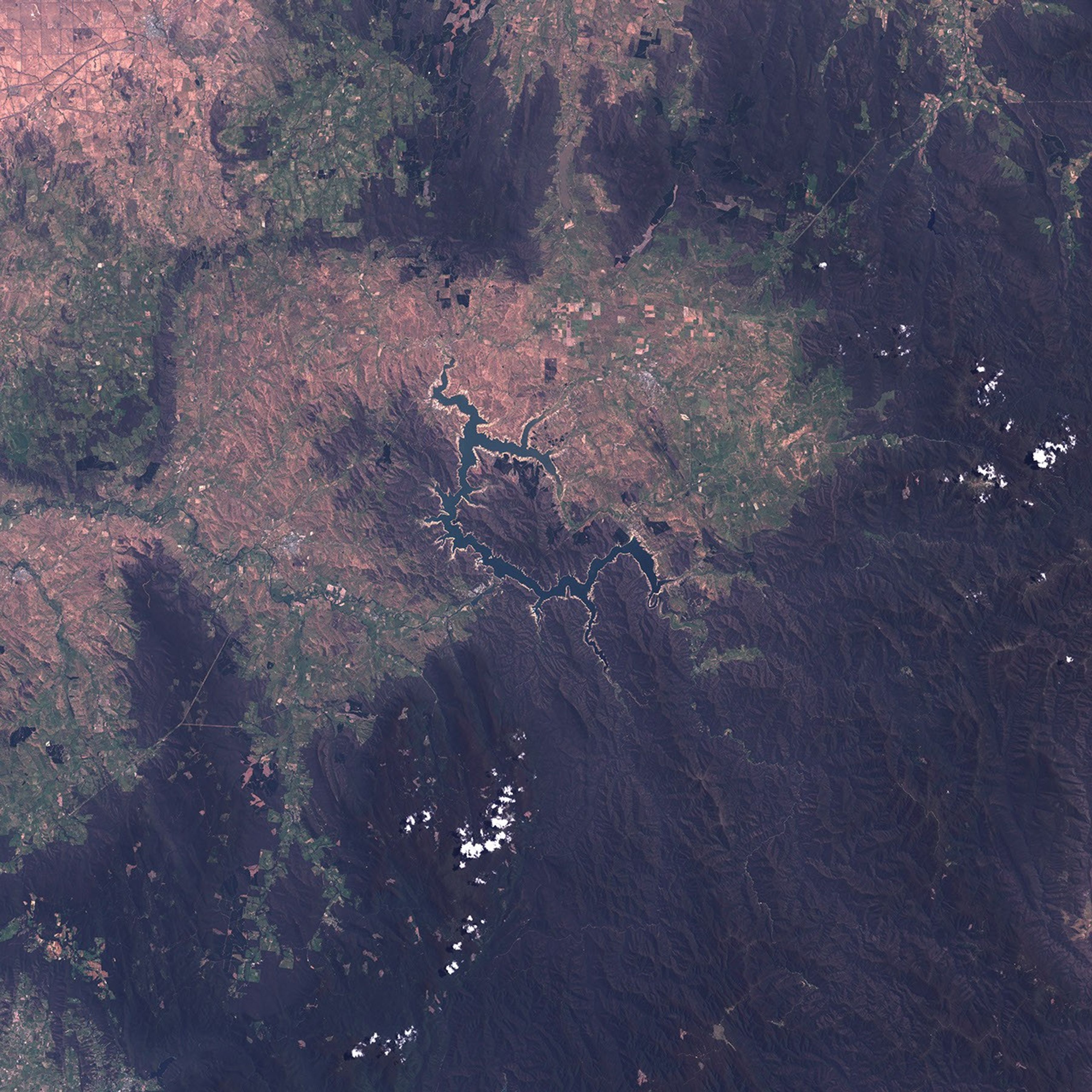 This natural-color Landsat 7 image shows the huge lake, which is more than 50 kilometers (30 miles) long from end to end and holds some five times the water capacity of Sydney Harbour when full (3,500,000 megaliters). It was created in 1950 by expanding the existing dam across the Goulburn River and catching water from several of its significant tributaries. The deep blue lake is surrounded by the Lake Eildon National Park (Fraser National Park on the western side was merged into this park in recent years). South of the lake lies the deep, dark greenery of the eucalyptus-covered hillsides of the Great Dividing Range. Surrounding the lake to the north, the Goulburn River Valley appears as a patchwork of pale green and light pink from irrigated farms. The faint reddish color comes from rich alluvial soil here; some of Australia’s best wineries are located in this valley. Grey splotches mark the location of small cities and towns in the Goulburn Valley such as Mansfield, Eildon, Alexandria, and Marysville.
