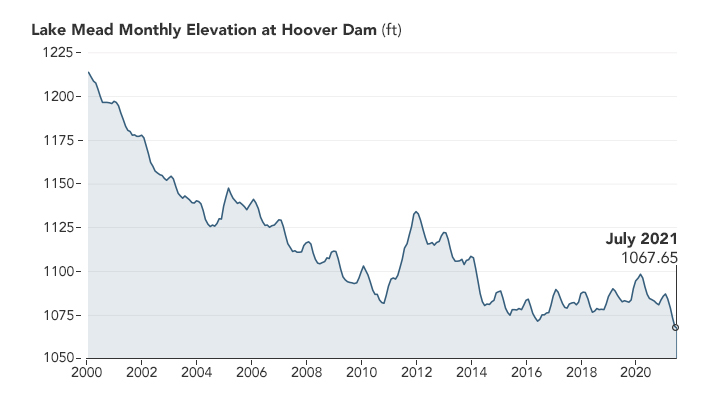 The lake elevation data below come from the U.S. Bureau of Reclamation, which manages Lake Mead, Lake Powell, and other portions of the Colorado River watershed. At the end of July 2021, the water elevation at the Hoover Dam was 1067.65 feet (325.4 meters) above sea level, the lowest since April 1937, when the lake was still being filled. The elevation at the end of July 2000—around the time of the Landsat 7 images above and below—was 1199.97 feet (365.8 meters).