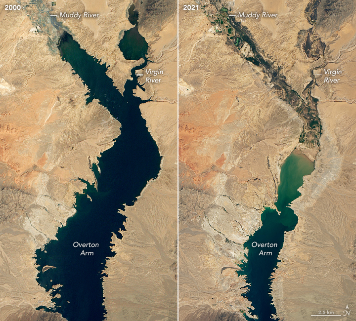 These natural-color images were acquired in August 2000 and August 2021 by Landsat 7 and Landsat 8. The tan fringes along the shoreline in 2021 are areas of the lakebed that would be underwater when the reservoir is filled closer to capacity. The phenomenon is often referred to as a “bathtub ring.”