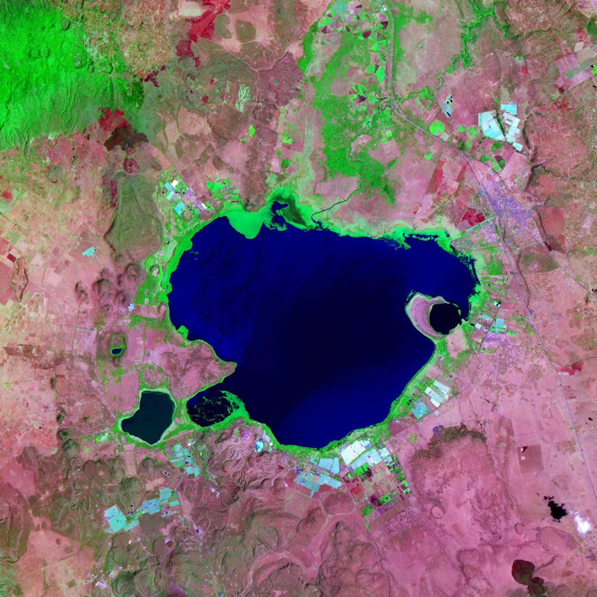The Advanced Spaceborne Thermal Emission and Reflection Radiometer (ASTER) flying on NASA’s Terra satellite captured this image of Lake Naivasha on February 2, 2008. Bright white squares mix with fields of green, tan, and purple along the shores of the lake. Sunlight glints off the long rows of glass greenhouses, turning them silvery blue and white in this view from space. Fallow fields are tan and pink, while growing plants turn the ground bright green. Roses, lilies, and carnations are the most common flowers grown in the greenhouses and fields scattered around the lake. The large-scale industry shown here extends into small-scale rural farms elsewhere in Kenya, where smaller filler flowers are grown.