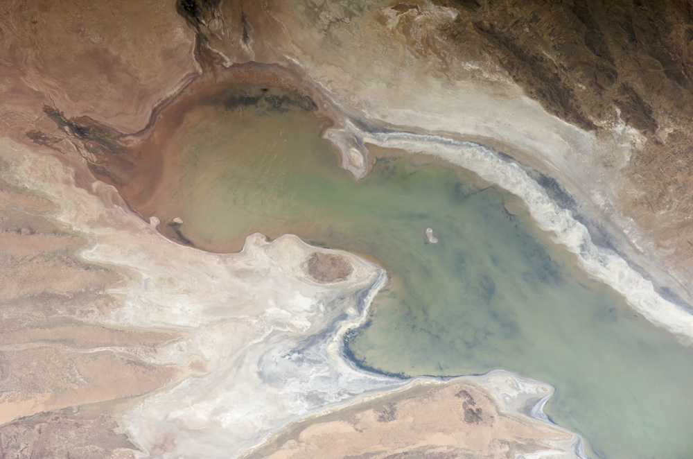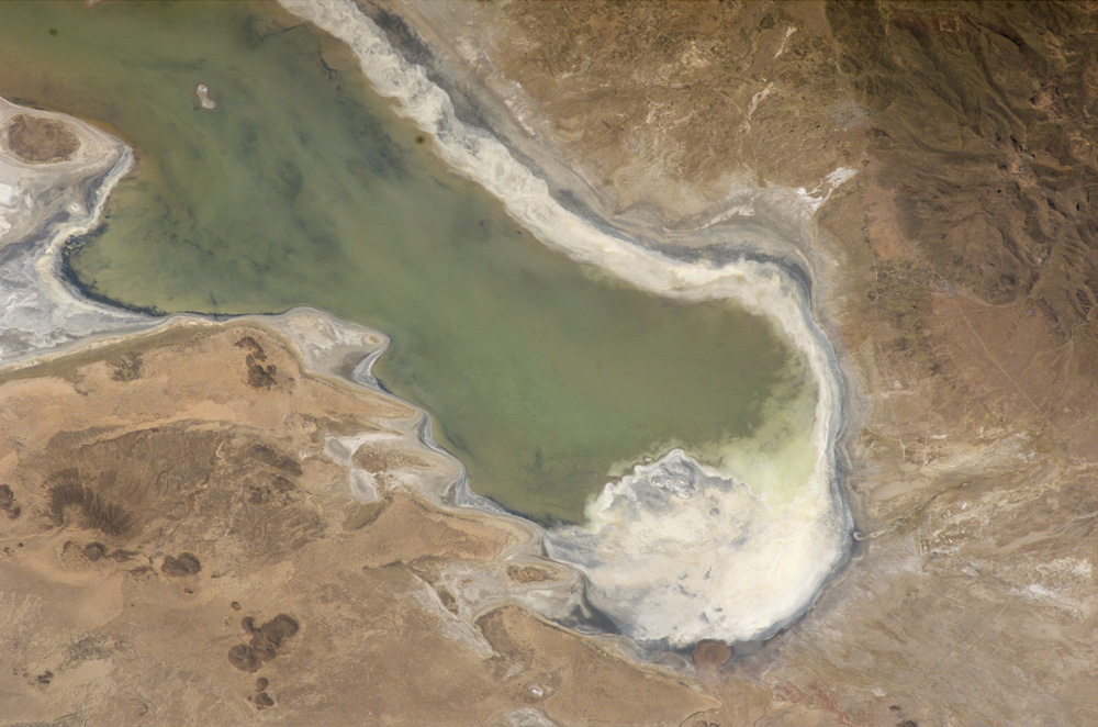 These photographs were taken in November 2005 (whole lake) and March 2006 (detail) by the Expedition 12 crew of the International Space Station. In November, water levels had dropped, exposing large tracts of salt and mud flats. A wet and cool period between December 2005 and the end of February 2006 resulted in flooding of Poopó with muddy waters from the Desaguadero River. The area of the March 9 photograph is indicated on the November 3 mosaic by a white polygon. Comparison of the photographs shows the extent of flooding of the western salt flats—sufficient to create an ephemeral island. The ISS crew is tasked to track such changes, which are related to regional weather patterns. Lake Poopó’s sensitivity to precipitation in the high Andes (possibly reflecting larger climate cycles) provides an excellent visual indicator of weather and climate trends.